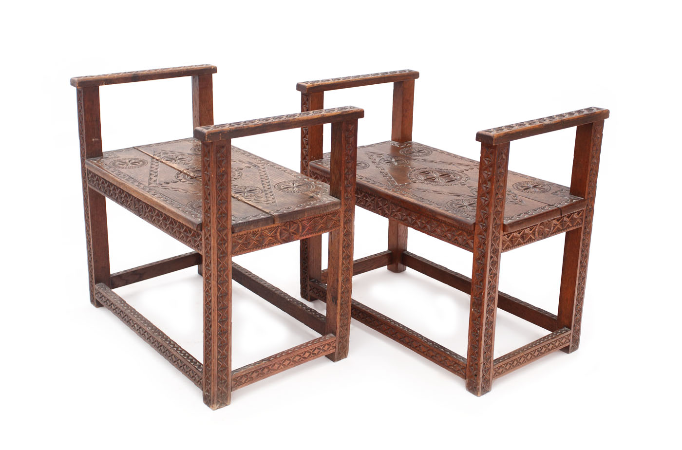 406. Pereche de banchete Neo-Românești, din lemn de stejar, cca. 1910-1940