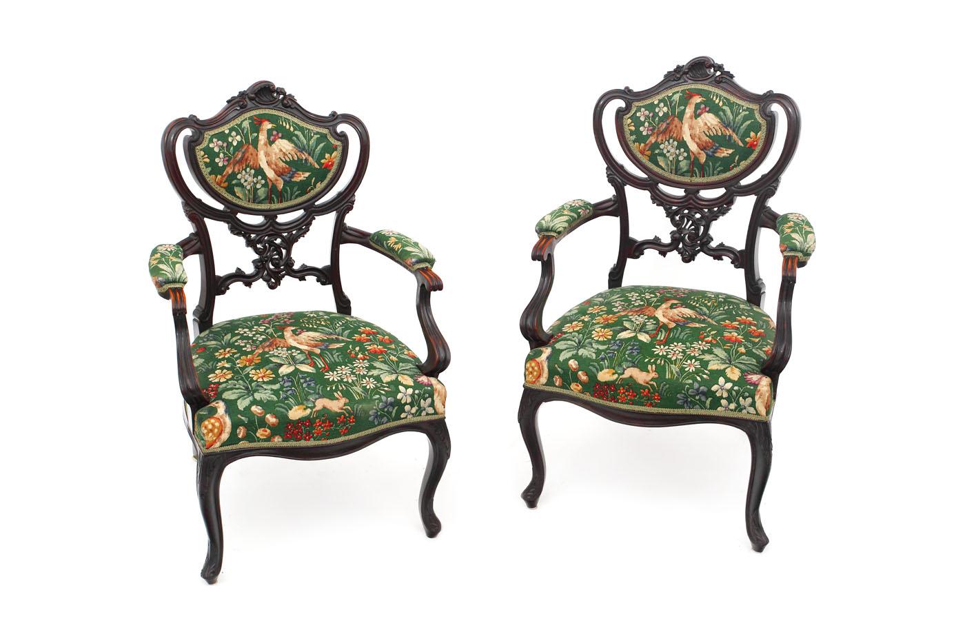 Fotolii pe picioare galbate, cotiere ușor retrase, parțial tapițate, spătar medalion cu decor decupat cu motive vegetale și ecuson tapițat surmontat de motiv scoică. Piese în stil Chippendale, cu tapițerie din creton imprimat cu vânat, flori și fructe pe fond verde.