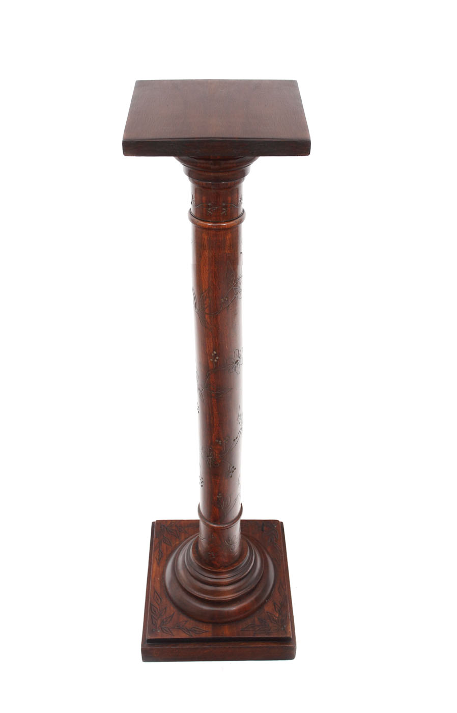 Talpă și blat pătrate, picior fus de coloană decorat cu motive floral-vegetale incizate în maniera anilor 1900.