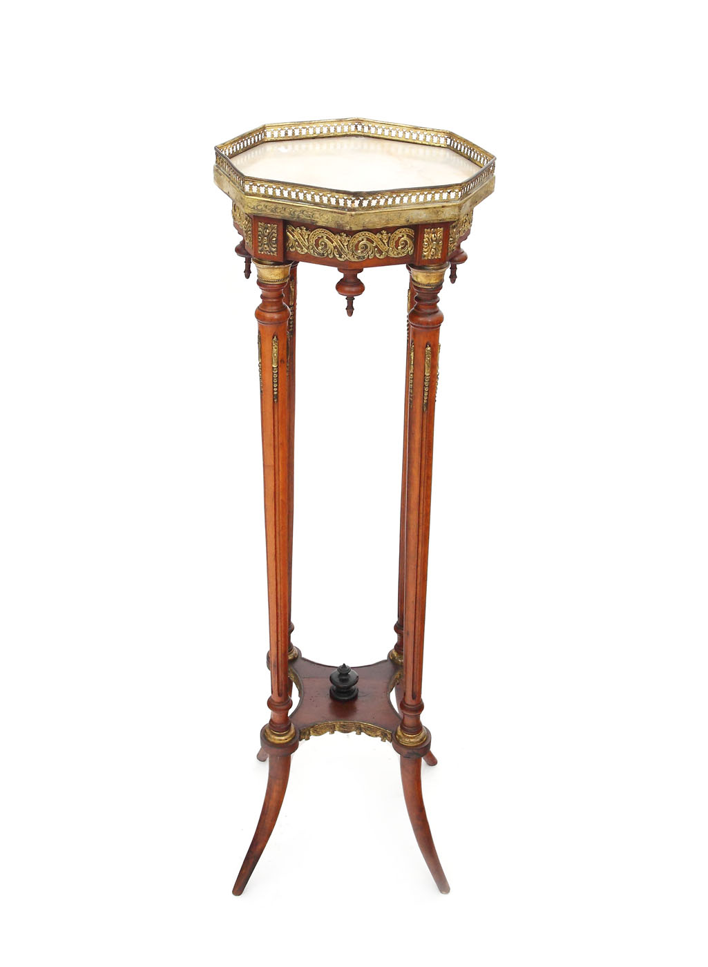 Blat octogonal din alabastru bordat cu grilaj din alamă ajurată, centură cu friză vrejuri vegetale și decor de ornamente titirez. Picioare înalte canelate unite prin poliță și arcuite la bază.