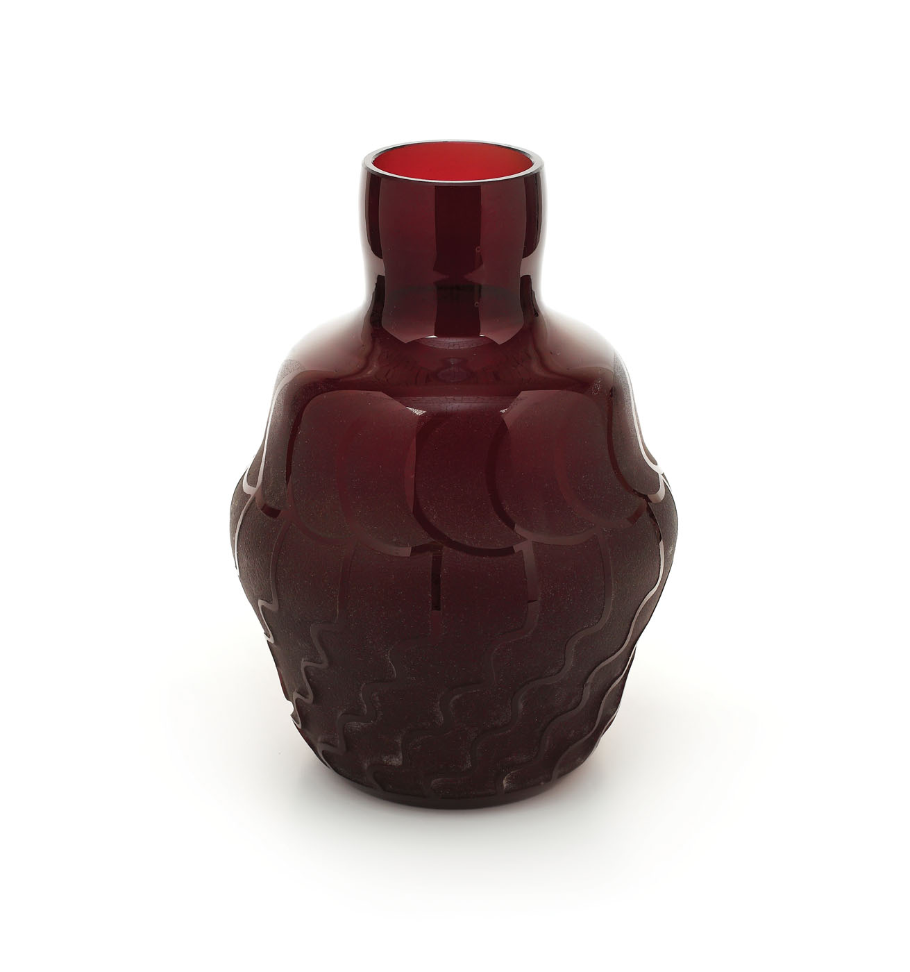 Vas bulbar îngustat la partea superioară, cu gât scurt, tubular. Decorul cu friză de solzi superior și inferior cu valuri, pe fond violet - rubiniu. Stil Art Deco.