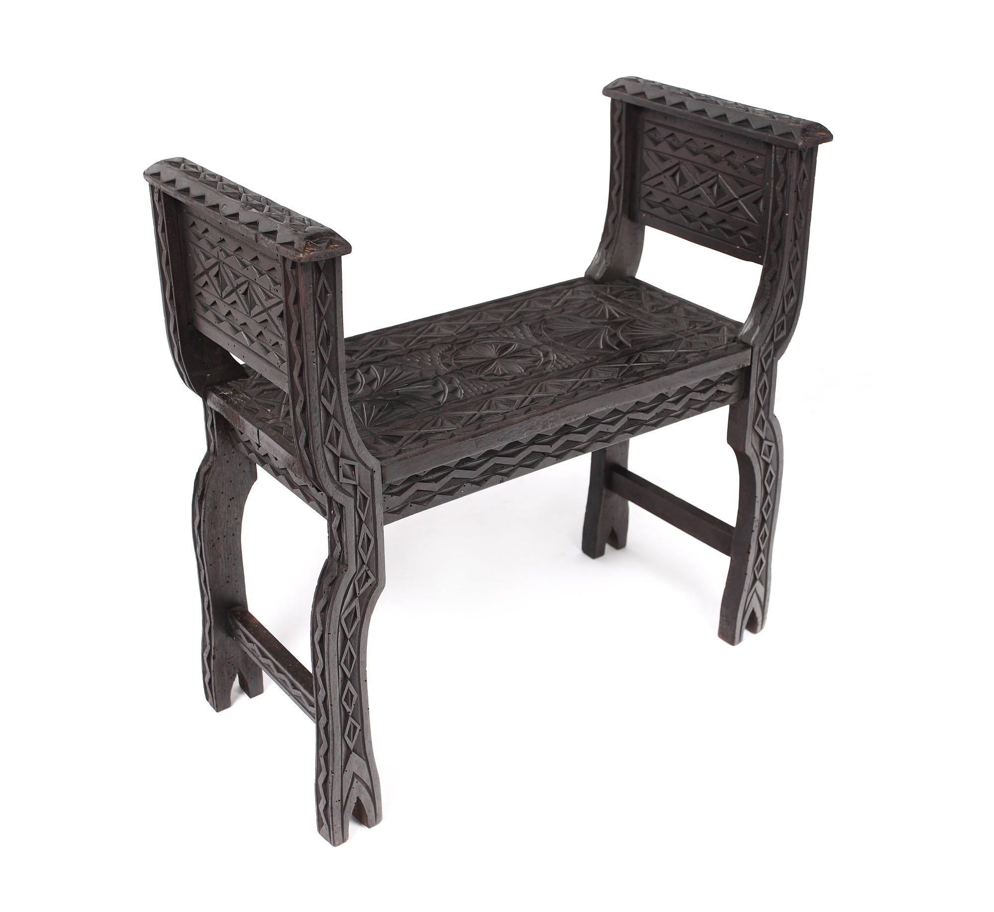 Banchetă mică, pe picioare montanți susținând cotiere, cu șezută decorată cu motive decorative stilizate, în stil Neo-Românesc.