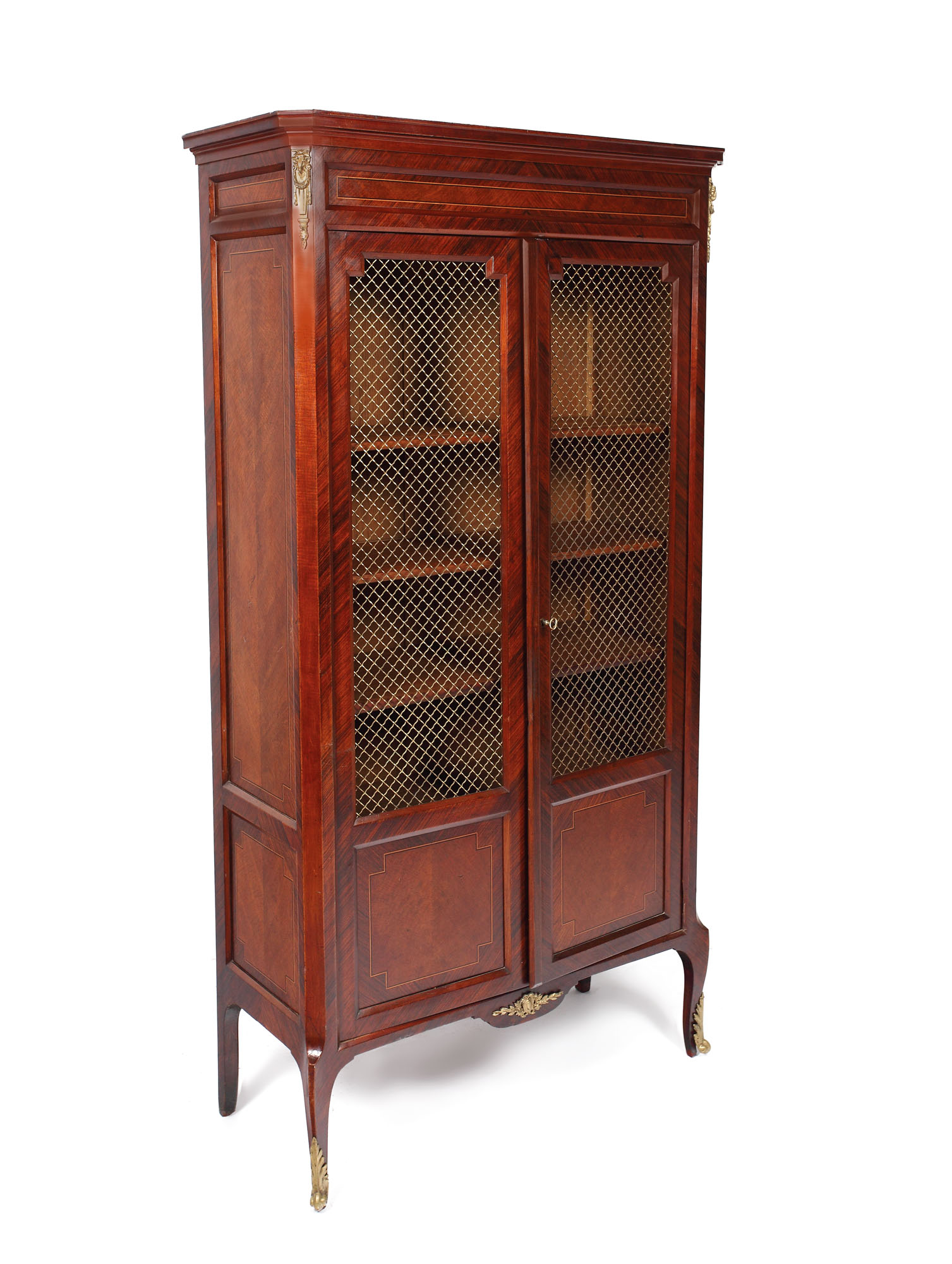 Bibliotecă în stil Louis XVI, pe picioare mărunte ușor galbate, cu două uși închise cu treiaj fin. Silueta simplă e punctată de baghete intarsiate și aplicații de bronz bucranii cu ghirlande și saboți vegetali.