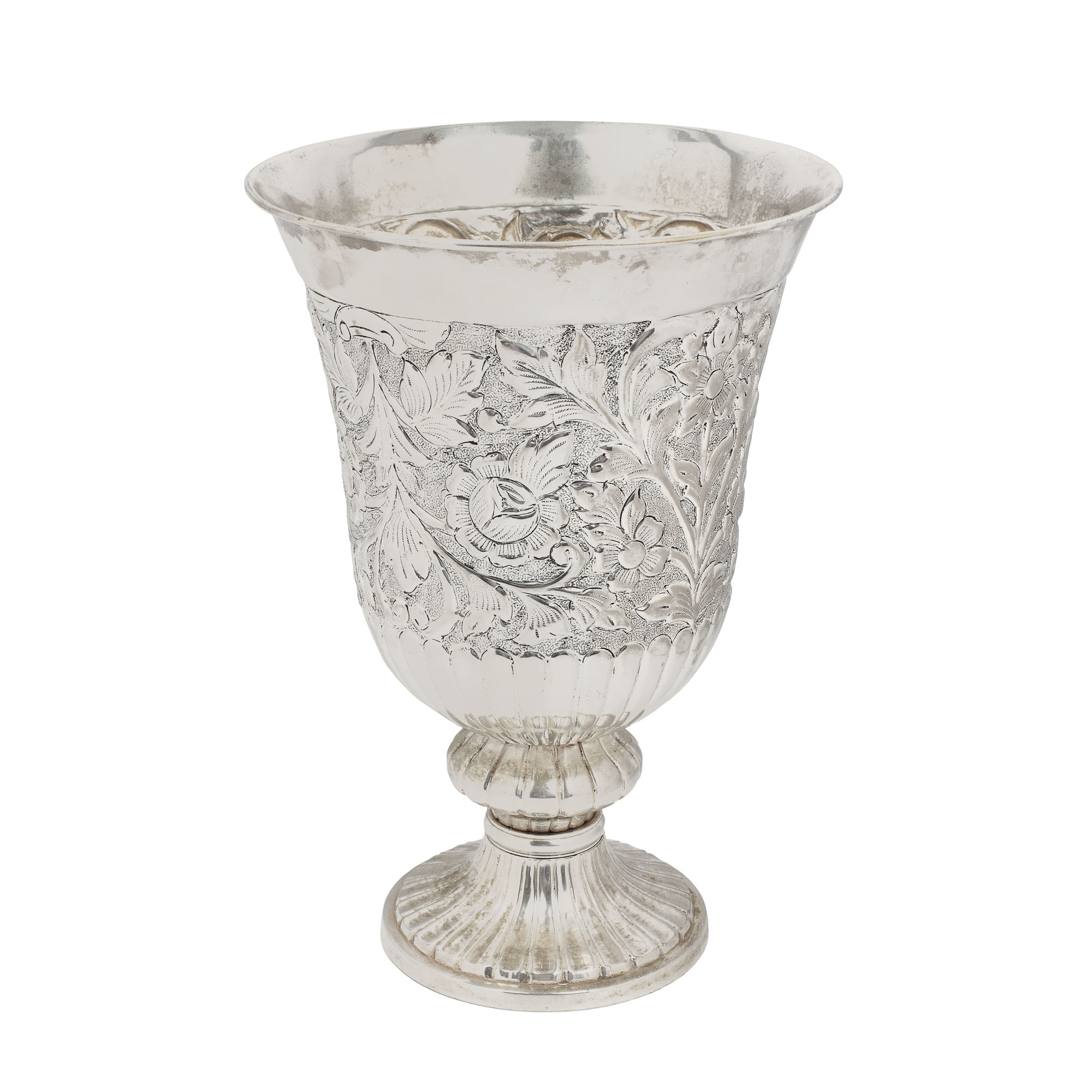 Cache-pot mare, pe talpă circulară, canelată, picior mărunt, corpul tronconic evazat, fiind decorat cu registru amplu de motive floral-vegetale. În stil eclectic.
