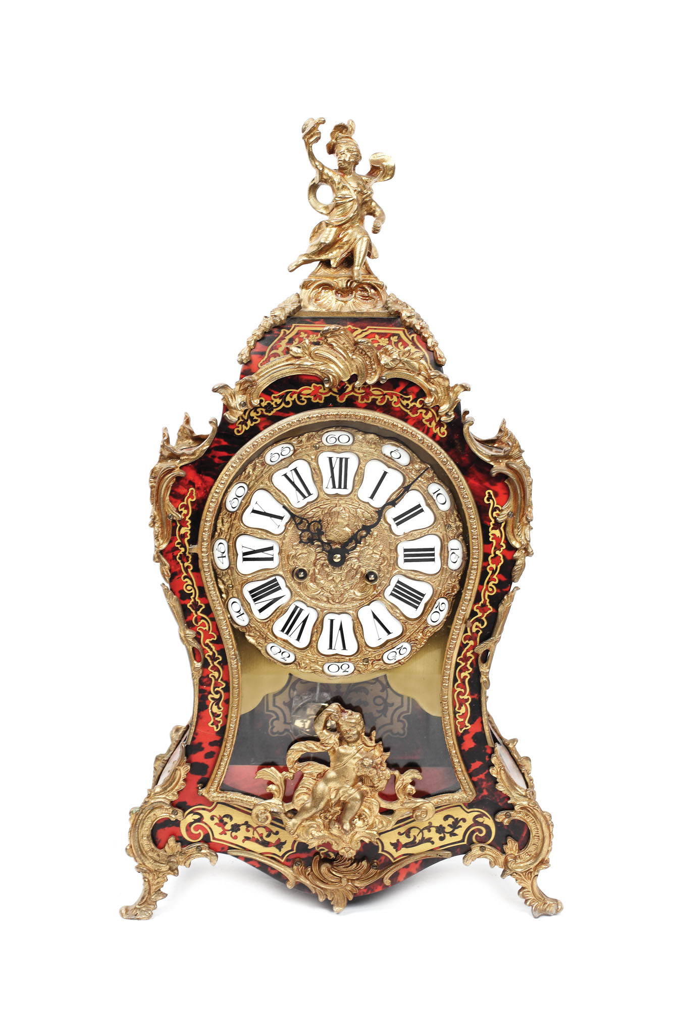 Ceas de șemineu, tip cartel, cu decor din alamă în manieră Boulle, cu aplicații din bronz, reprezentând volute vegetale și personaje. Cadran marcat cu cifre romane și arabe. Necesită revizie.