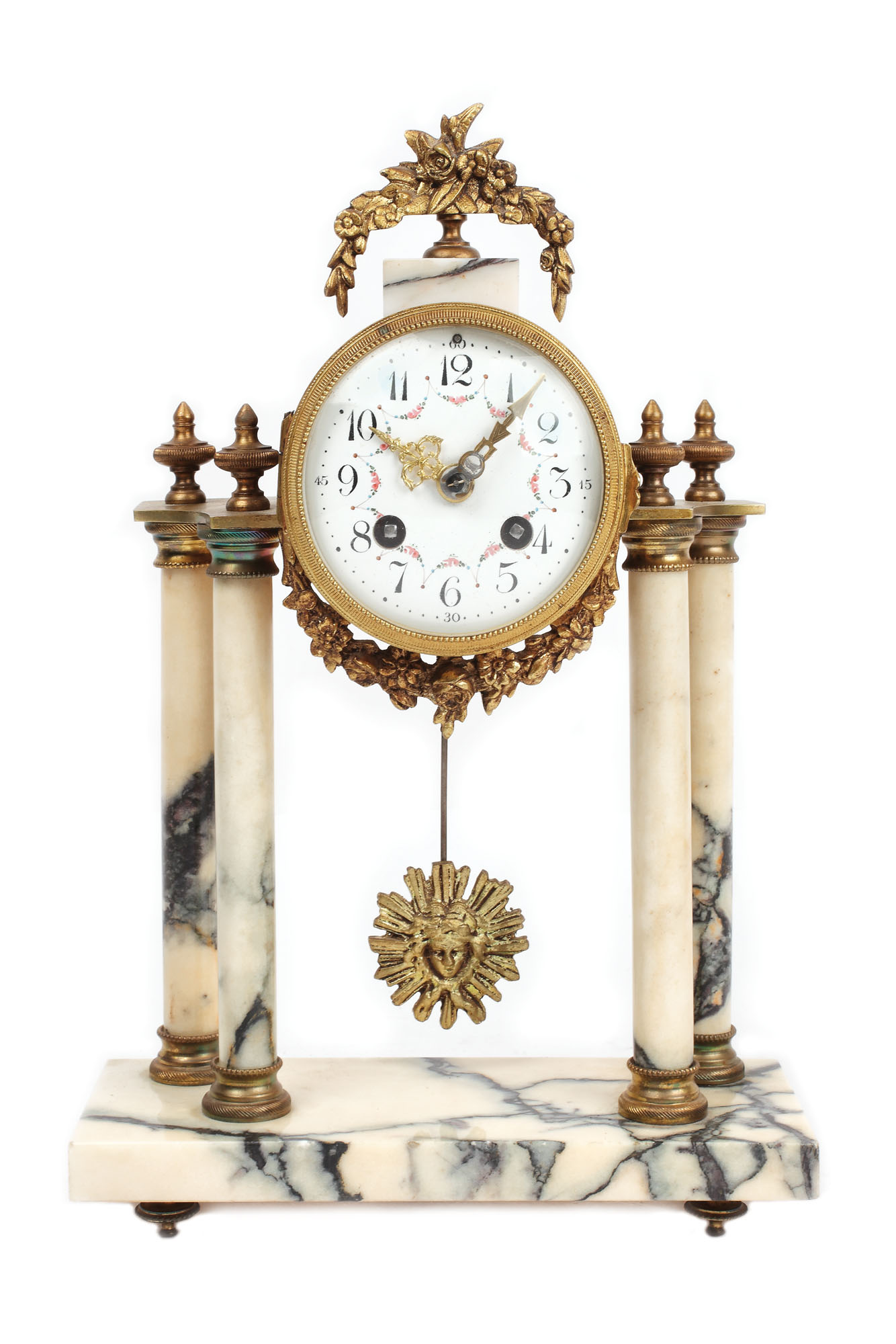 130. Ceas din marmură, în manieră Louis XVI, cu mecanism F. Marty, medaille d'or Paris, cca. 1900