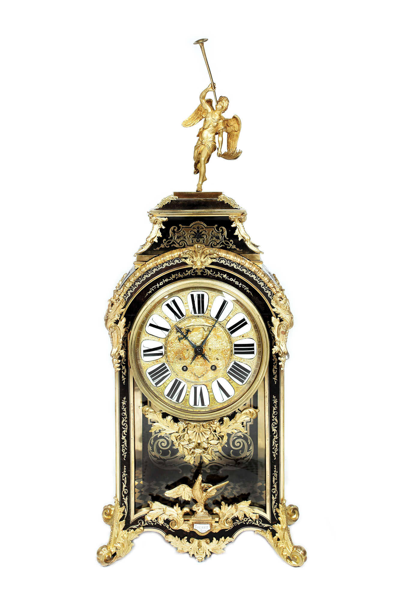Monumental pendul cartel, realizat în manieră Ludovic al XV-lea, lucrat în manieră Boulle, etichetat Thuret Paris. Familia de ceasornicari Thuret este recunoscută ca fiind una dintre remarcabilele dinastii de meşteşugari în orologerie din Parisul secolelor XVII şi XVIII. Cadranul este din bronz decorat şi aurit, având 12 cartuşe emailate pentru cifrele romane. Piesa necesită revizie.