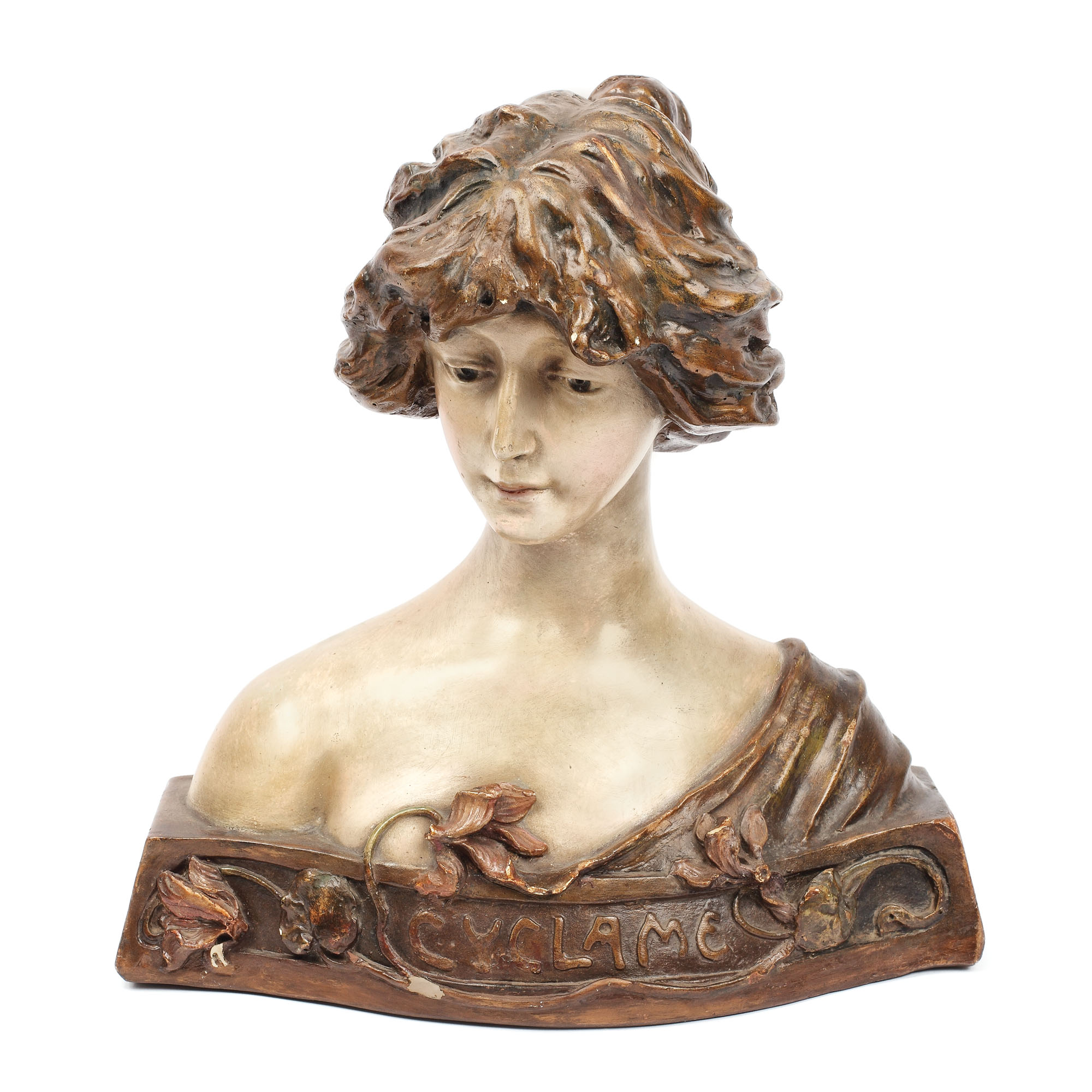 Bust de tânără ”Cyclame”, după modelul realizat de J. Schmidt, pe bază poligonală, cu decor floral vegetal mărunt. În stil Art Nouveau. Piesa prezintă o mică ciobitură la bază.