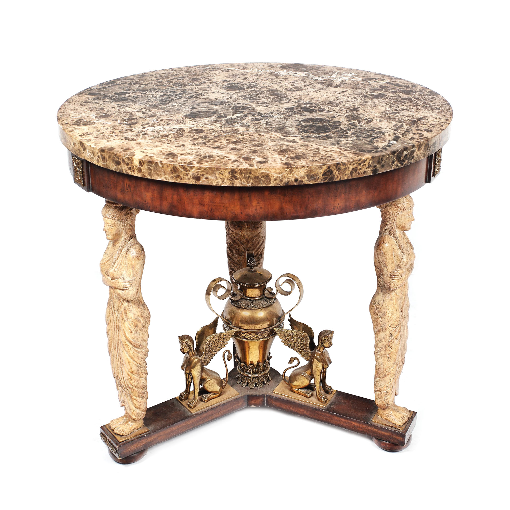 Masă mare de centru, în stil Empire, pe trei picioare herme, unite la partea inferioară de baghete surmontate de sfincși din bronz, ce anturează urnă convențională cu capac. Blatul circular este din marmură verde-gris cu venatură albă și brun.
