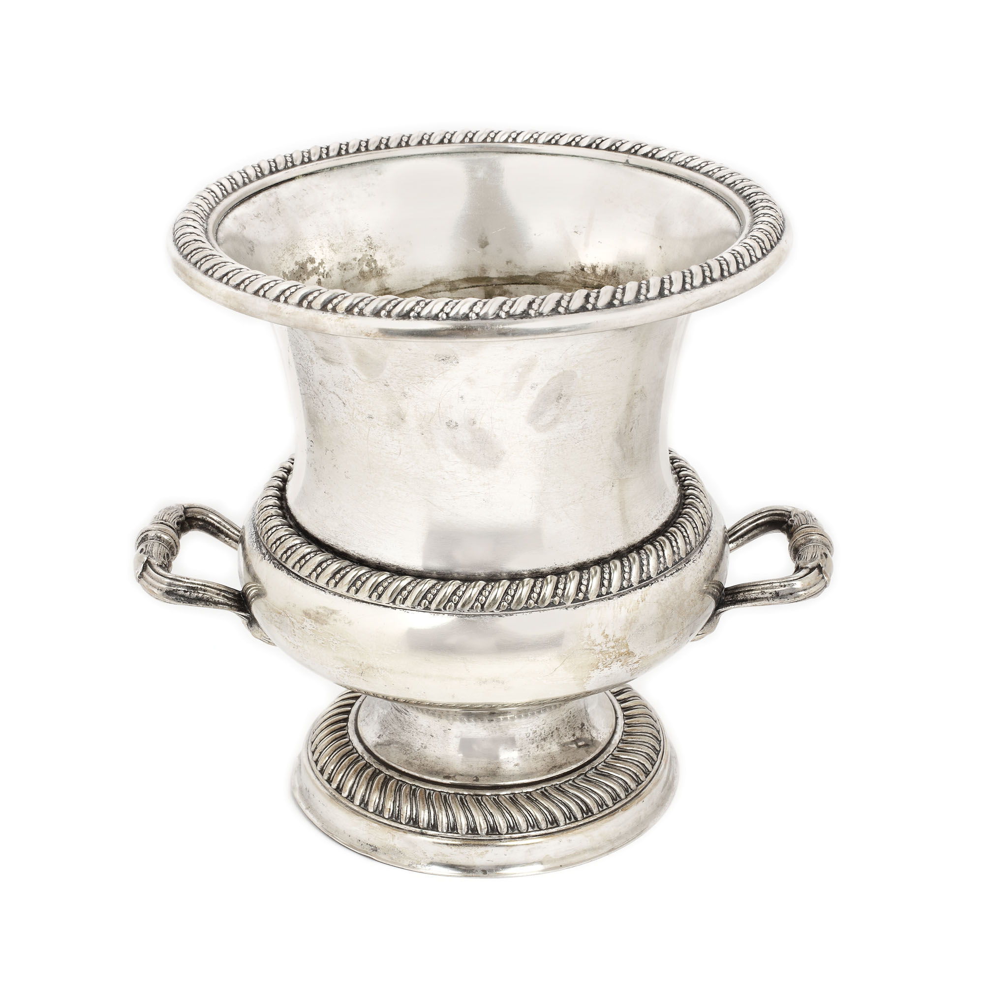Elegantă frapieră, cu decor Neo-Clasic, pe talpă circulară, picior mărunt și anse baghete vegetale cu ruban. Suprafața lisă este ritmată de registre torsadate.