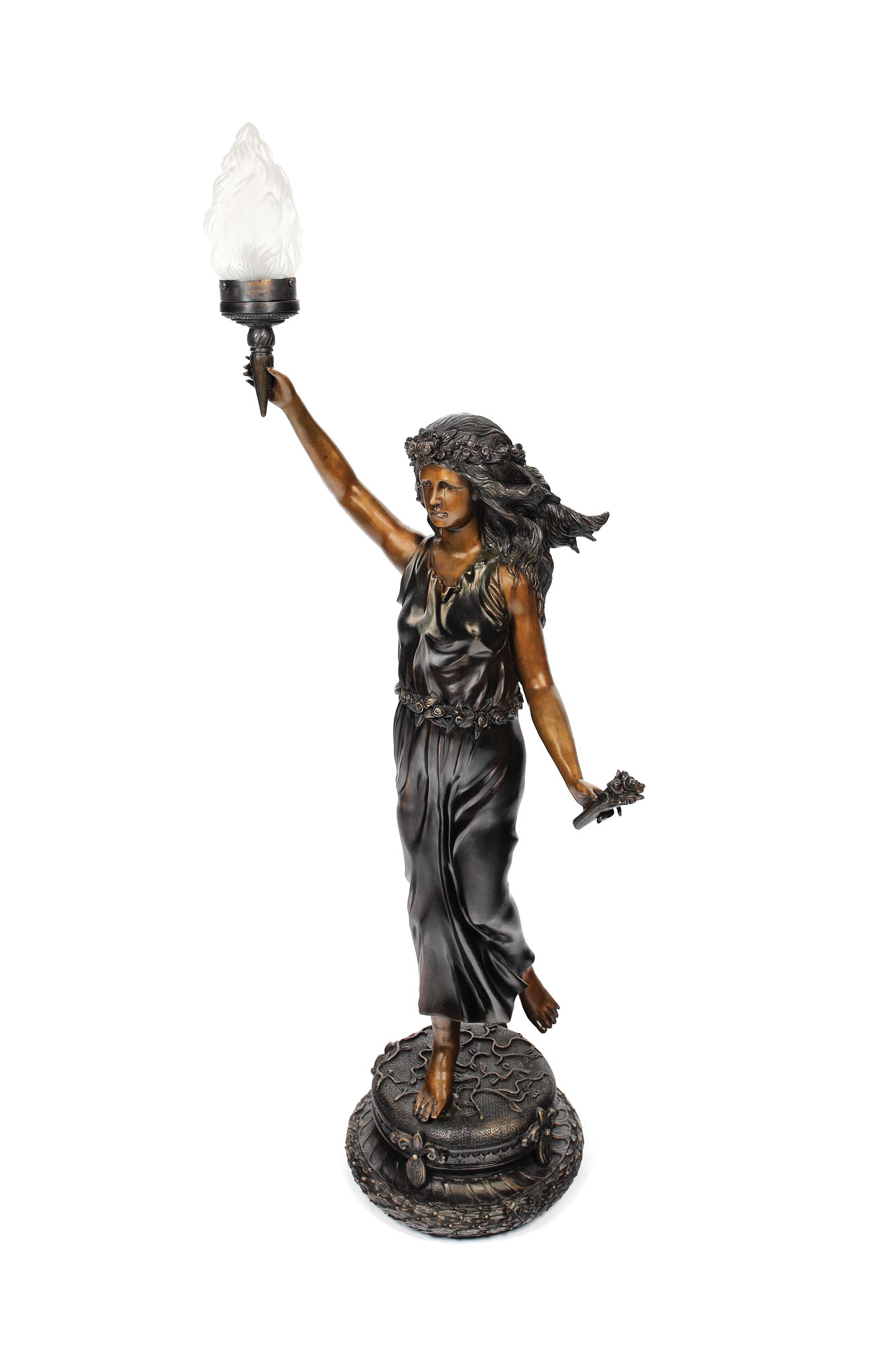 Figurină ronde-bosse - tânără drapată având păr lung şi coroniţă de flori, cu un buchet de flori în mâna stângă şi dreapta ridicată susţinând cupa-lampă pe un soclu circular cu decor de ruban. Stil Art Nouveau. În genul lucrărilor lui August Moreau.