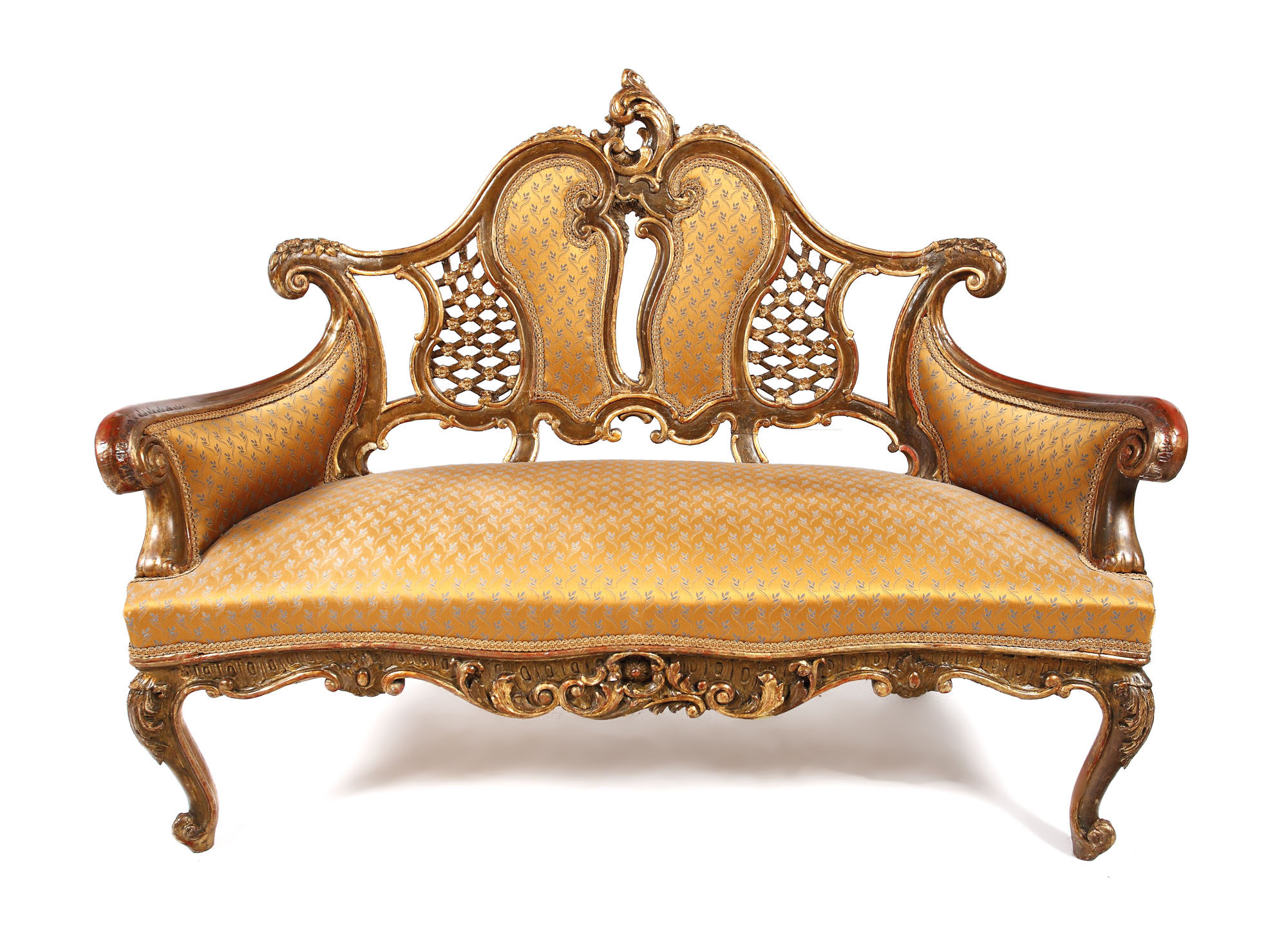 Garnitură amplă de salon, formată din masă, canapea, două fotolii și două scaune. Piese monumentale sunt realizate în stil eclectic, mixând elemente baroce cu elemente rococo: picioare galbate, brațe amplu evazate, centuri festonate decorate abundent cu motive vegetale, spătare cu ajurate, alternând suprafețe pline, tapițate, cu treiaje. Tapițerie recentă.