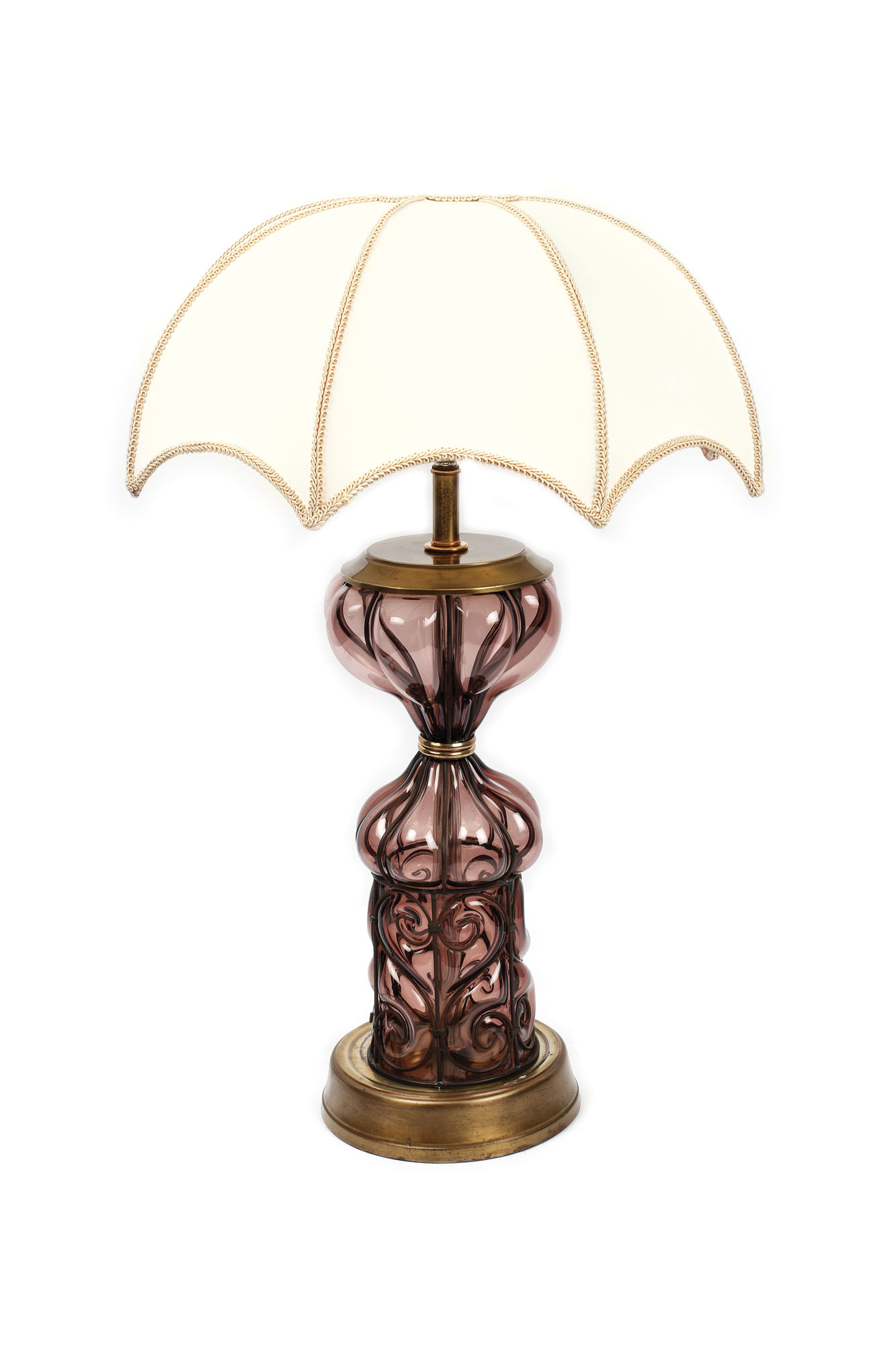 Lampă mare de masă, în stil Art Deco, cu bază circulară din alamă, picior balustru din sticlă colorată violet fumuriu, subliniată de baghete de fier forjat, cu abat-jour amplu.
