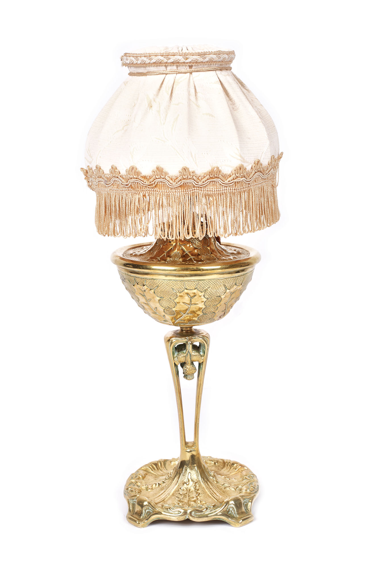 Lampă de masă cu bază, picior și corp decorate cu frunze de ciulin. Abat-jour recent. În stil Art Nouveau.