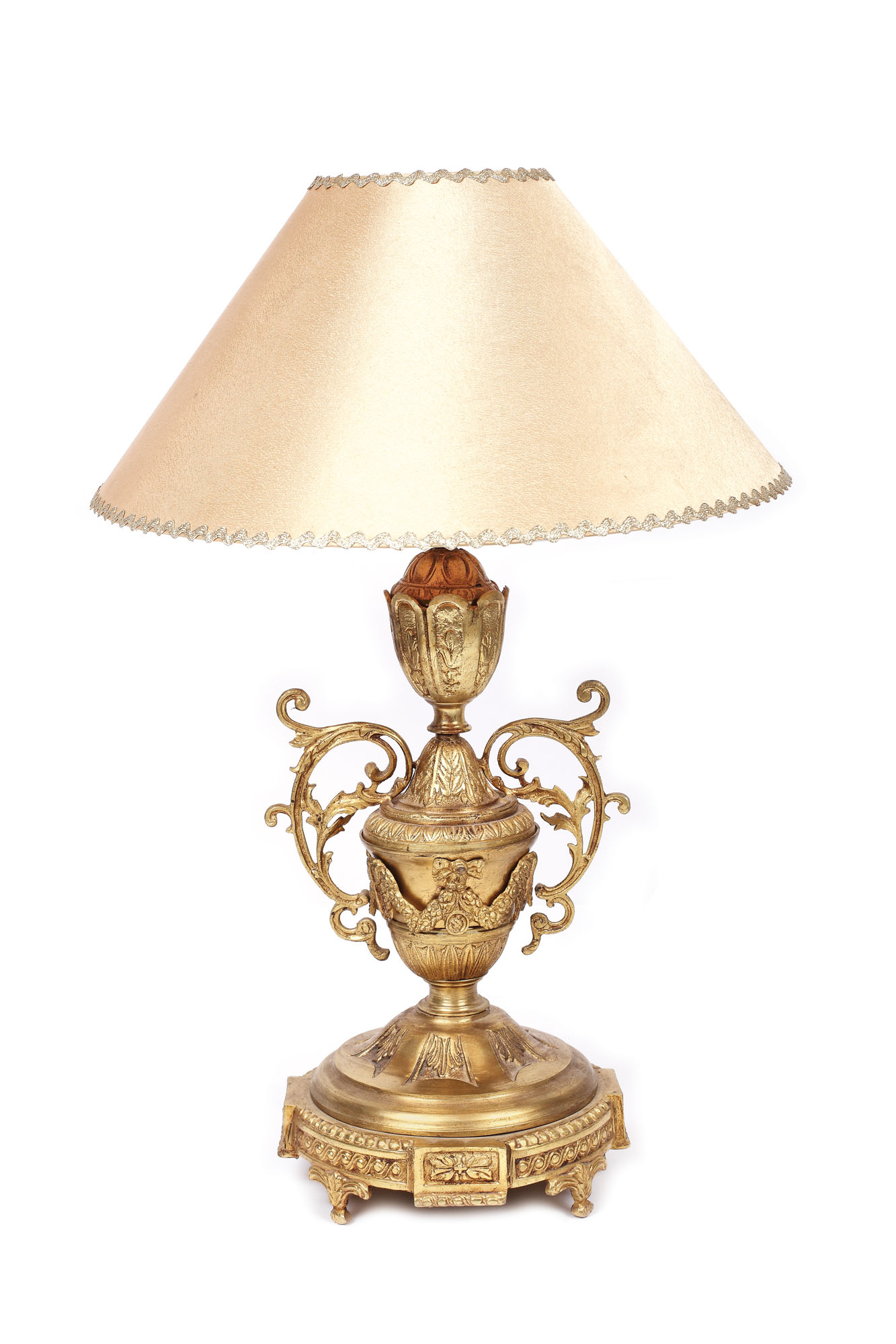 Lampă de masă monumentală, cu bază masivă, picior balustru profilat. Decor abundent de elemente neo-clasice - ove, perle, ghirlande, rozete. În stil eclectic.