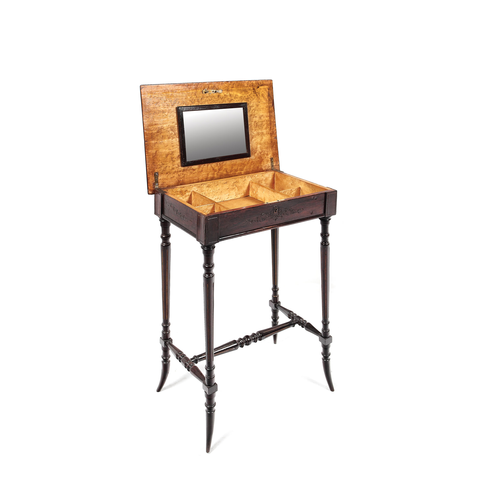 Măsuţă cu blatul dreptunghiular, un sertar la nivelul centurii, picioare baluştri subţiri, uşor oblici la bază, unite prin traverse în "H".