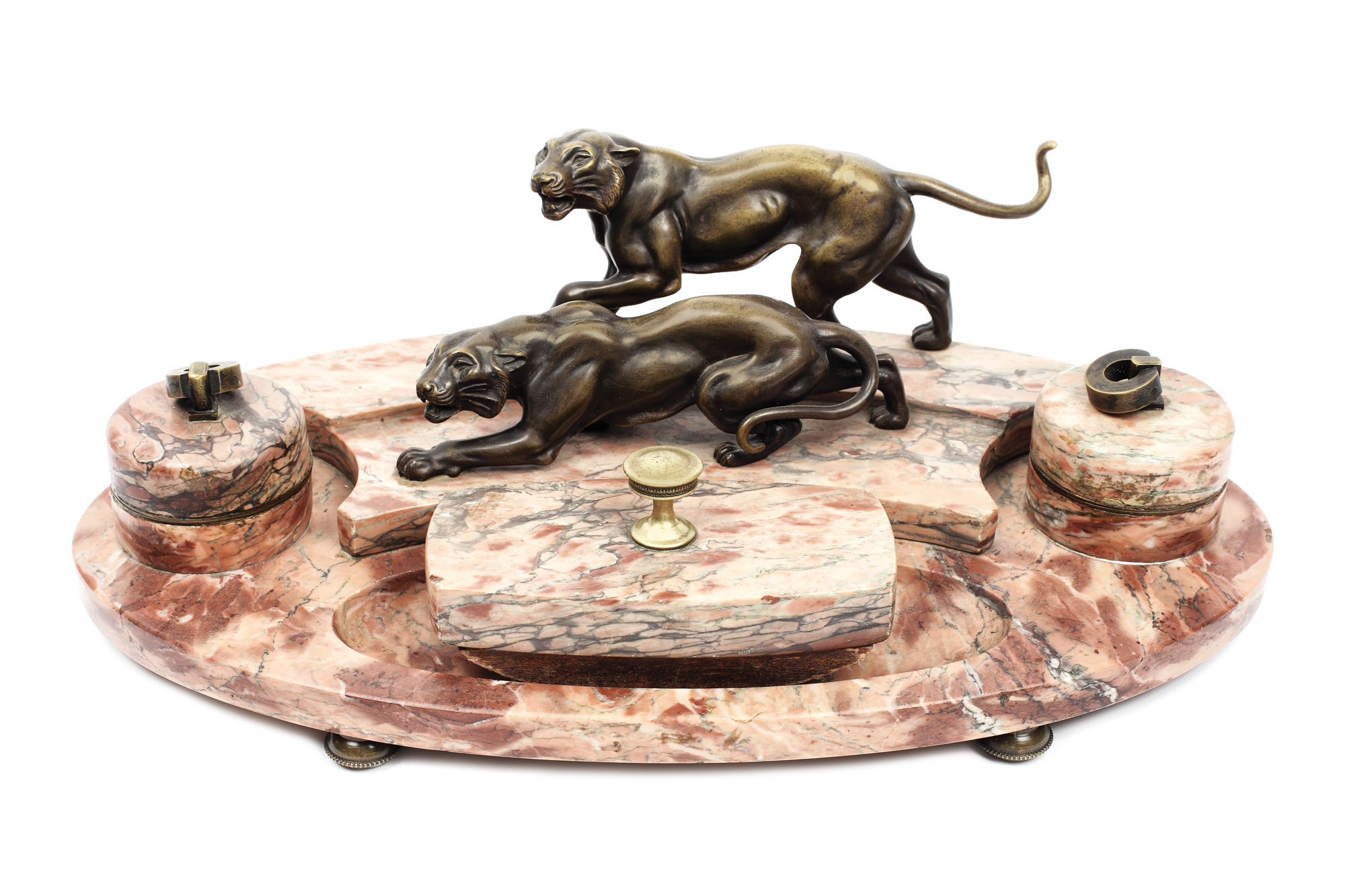 Set masiv de birou, format din blat oval din marmură roșie cu suport pentru instrumente de scris, lateral recipiente pentru cerneală și, detașabil, sugativă. Piesa este decorată cu statuete din bronz reprezentând pereche de pantere. În stil Art Deco