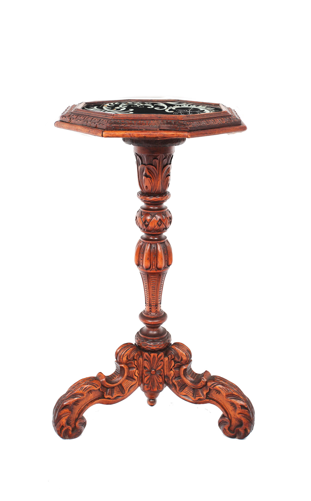 Picior balustru ramificat la bază în trei console, vrejuri vegetale, susţinând blatul octogonal, vopsit negru cu decor rocaille din staniu, protejat cu sticlă. Rămiţă din lemn cu registru lise anturând o friză măruntă cu frunze de acant. Piesă eclectică cu predominanţă stilistică Neo-Renaştere germană.