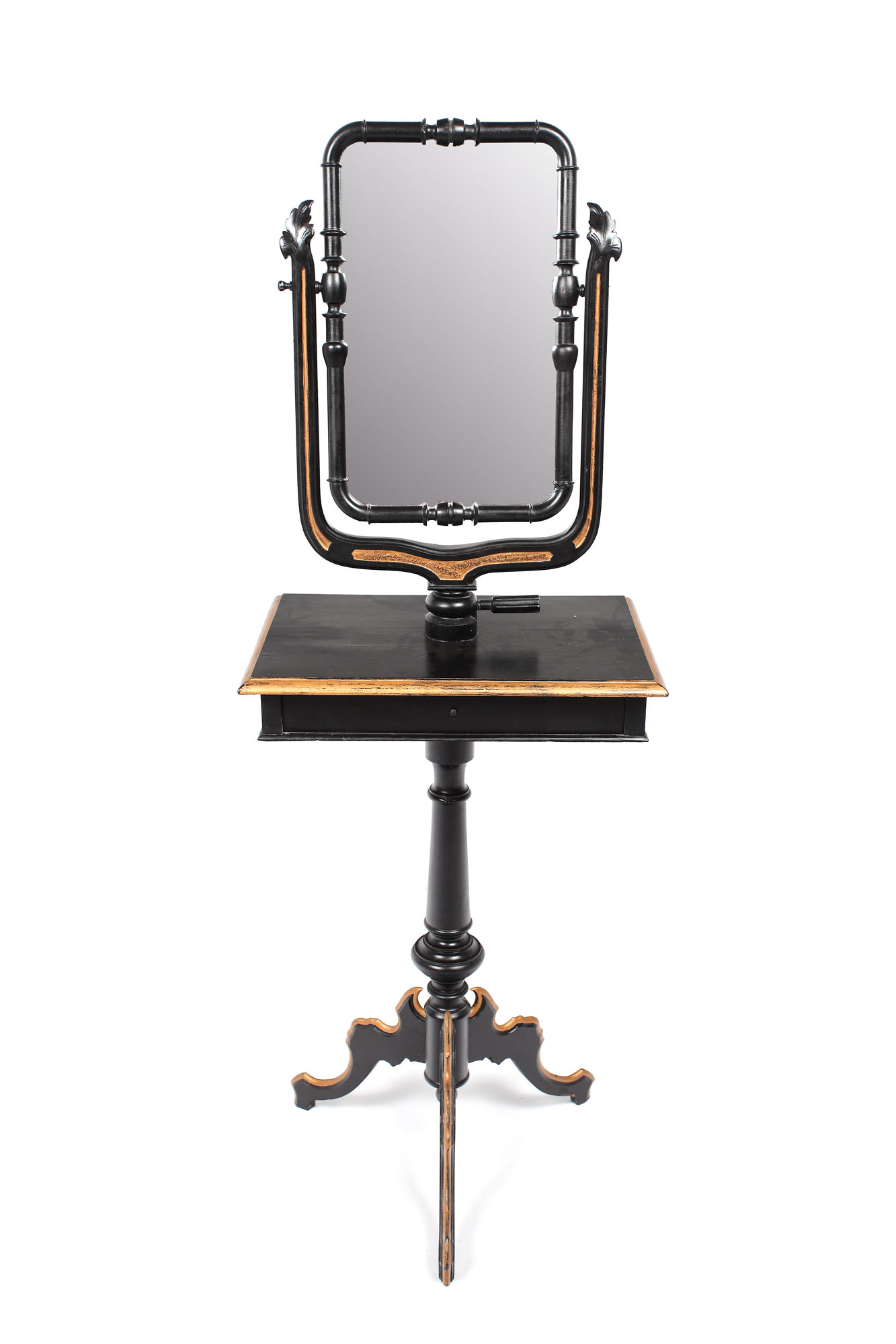 Măsuţă cu blat dreptunghiular, sertar la nivelul centurii, cu o oglindă montată în 2 ramuri baluştri subţiri; picior central pilastru terminat în 3 ramuri console subliniate cu bronz. Stil eclectic.
