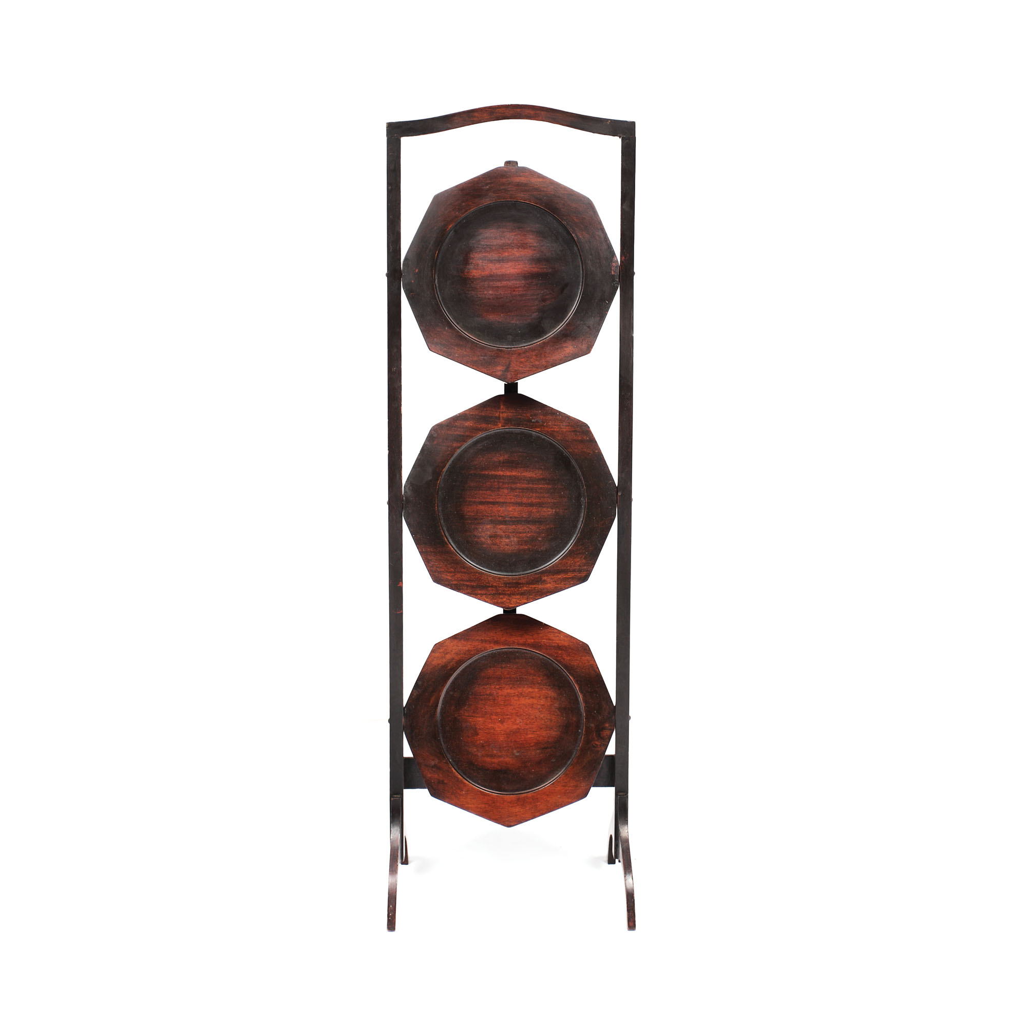 Masă mică de servit, tip ”dumbwaiter”, cu trei platane octogonale, rabatabile, susținute de cadru fix, în stil victorian.