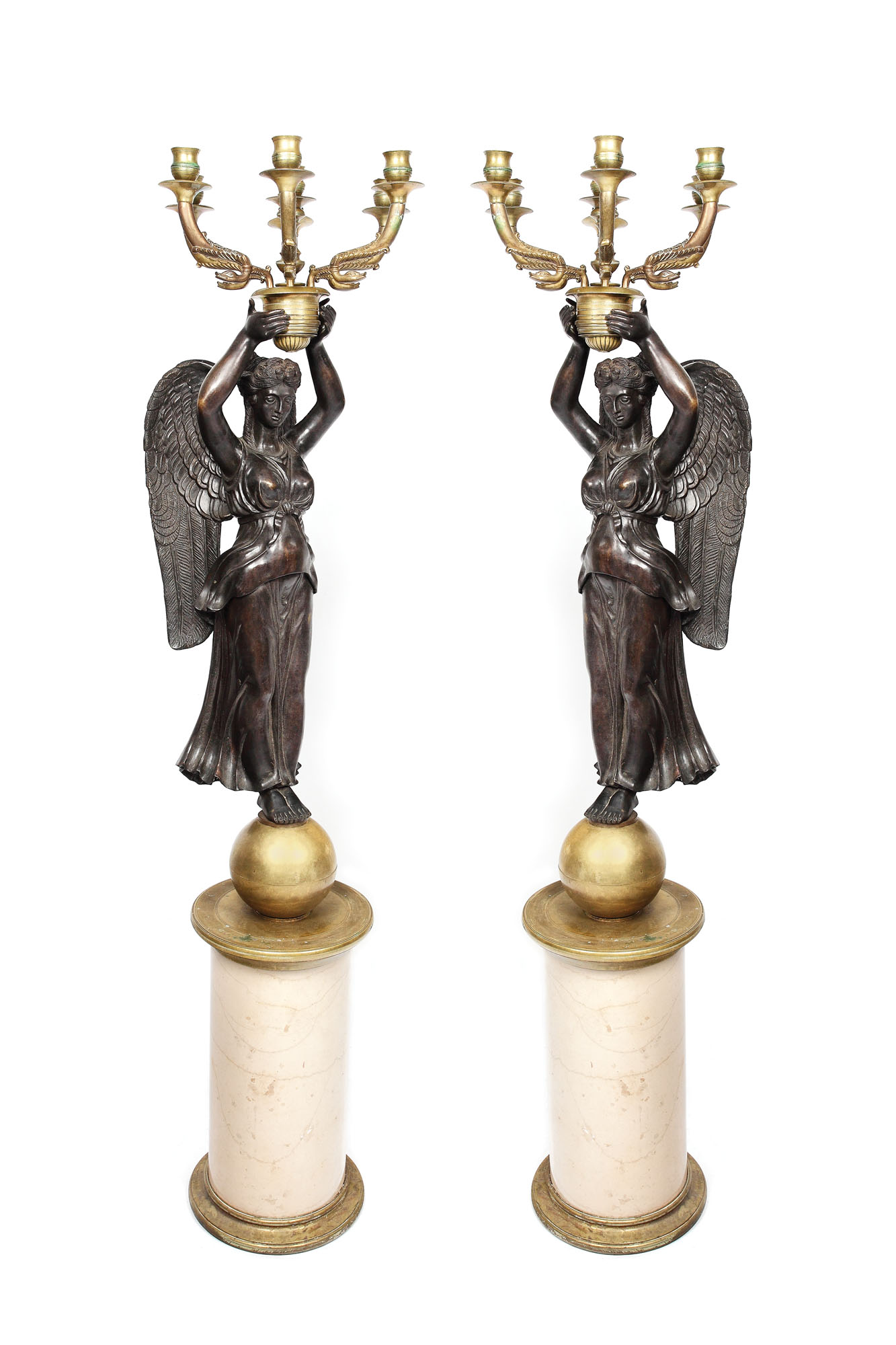 Pereche de sfeșnice monumentale, cu bază cilindrică masivă, susținând personaje feminine înnaripate, drapate (alegorii ale victoriei), susținând fiecare volute vegetale teminate în cinci lumini. În stil Empire.