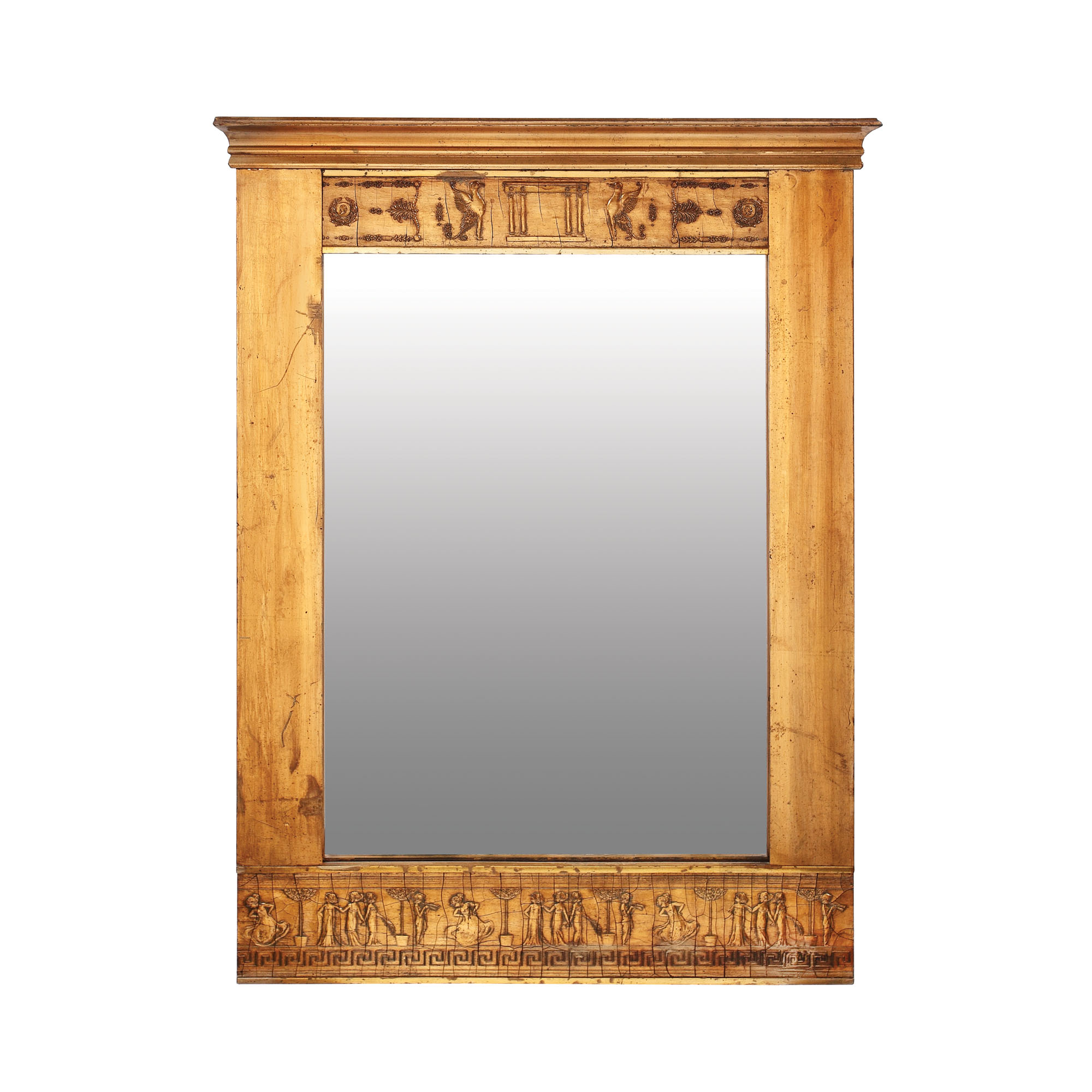 Oglindă dreptunghiulară cu cadru decorat cu friză de dansatoare antice și meandru grec, anthemion și efigii. În stil Neo-Clasic.