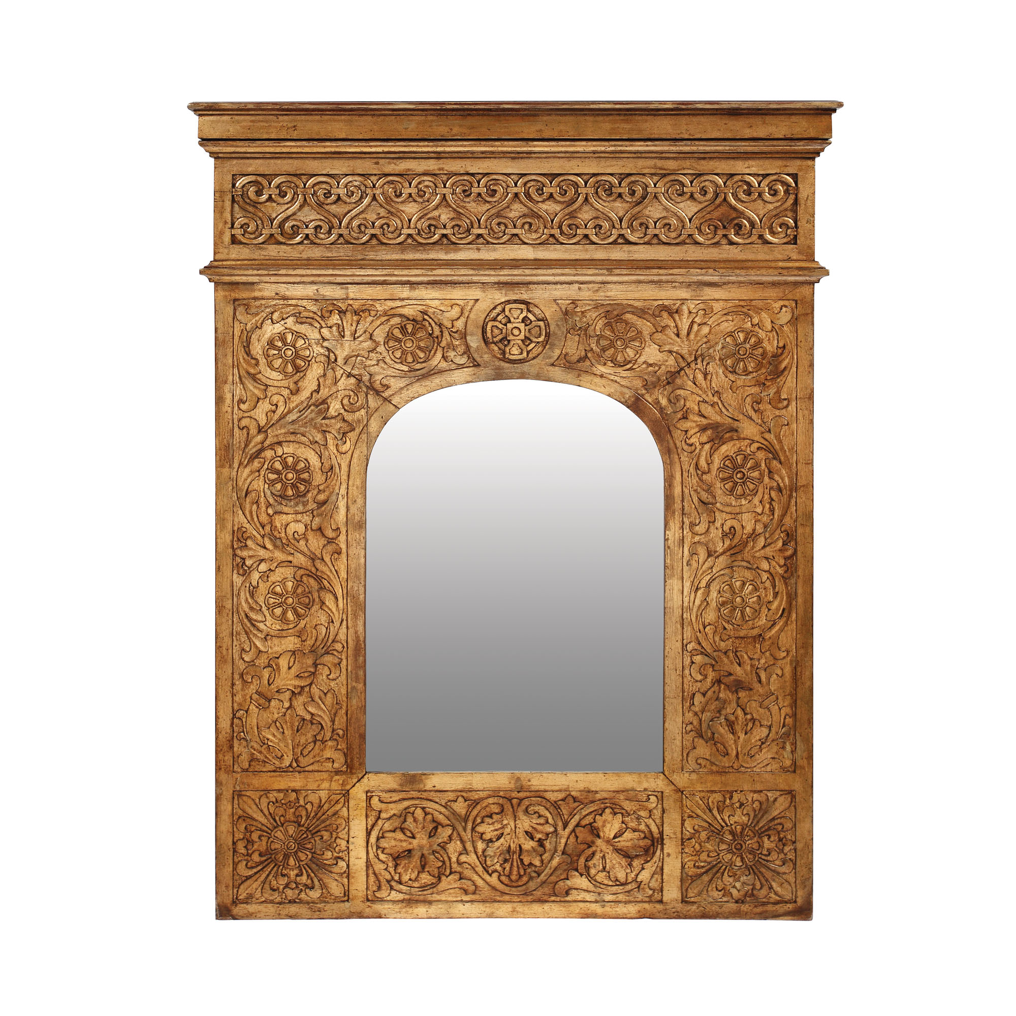 Oglindă cu ramă aurită, rectangulară, decorată cu reliefuri plate, cu rozete florale și vrejuri vegetale.
