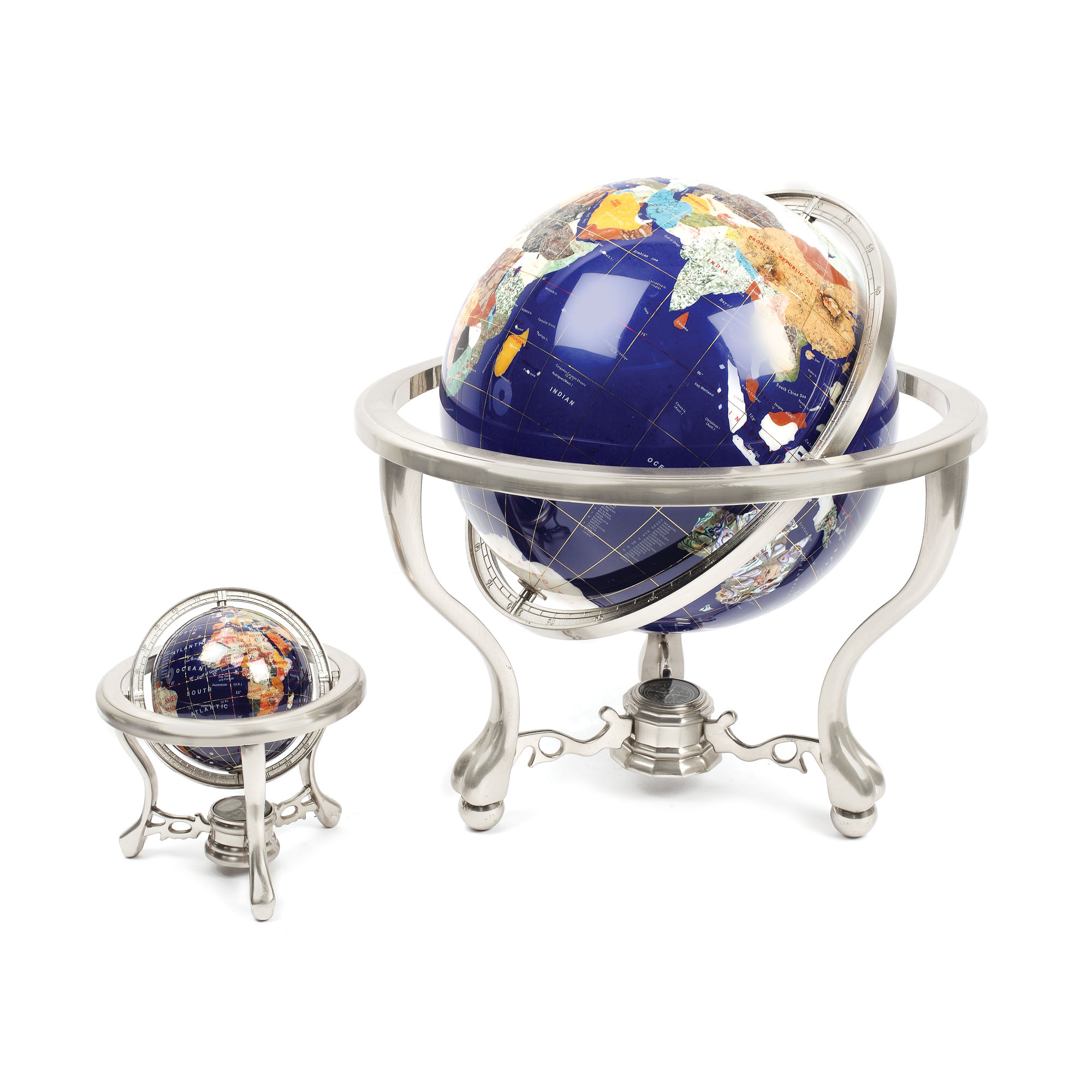 114. Pereche de globuri pământești decorative cu busolă, încrustate cu pietre semipreţioase şi sidef [Începutul sec. XXI]