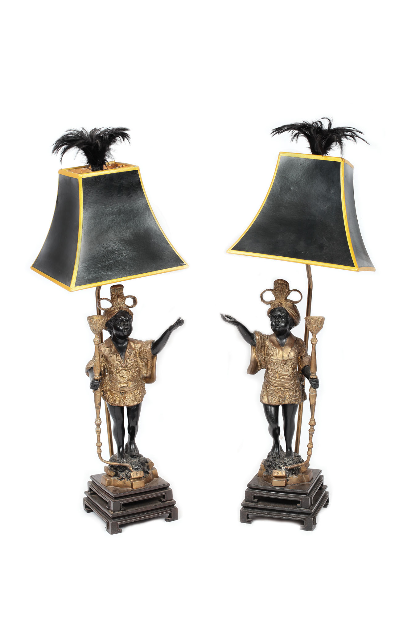 Pereche de lămpi de salon, pe bază tronconică profilată, cu picior reprezentând mauri din bronz în ronde bosse, susținând abat-jour din carton negru și auriu, surmontat de panaș. În stil eclectic.
