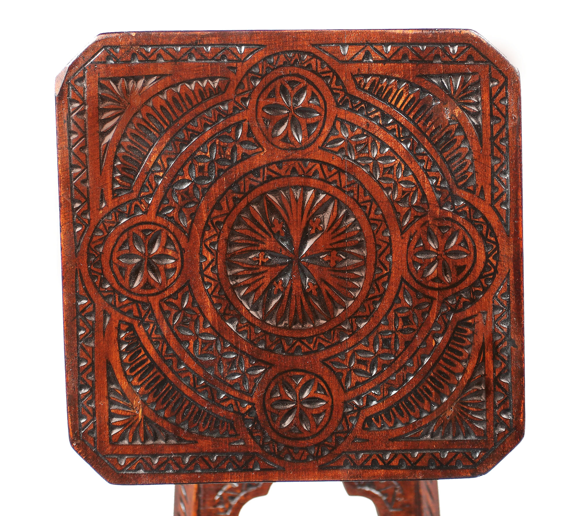 Piedestale înalte, suple cu blaturi pătrate sculptate în meplat cu motive solare, brâncoveneşti, centuri înguste decupate trilobat, picioare cu motive dăltuite unite la bază prin policioare pătrate cu decor rozetă şi motive specifice artei româneşti. Stil Neo-Românesc.