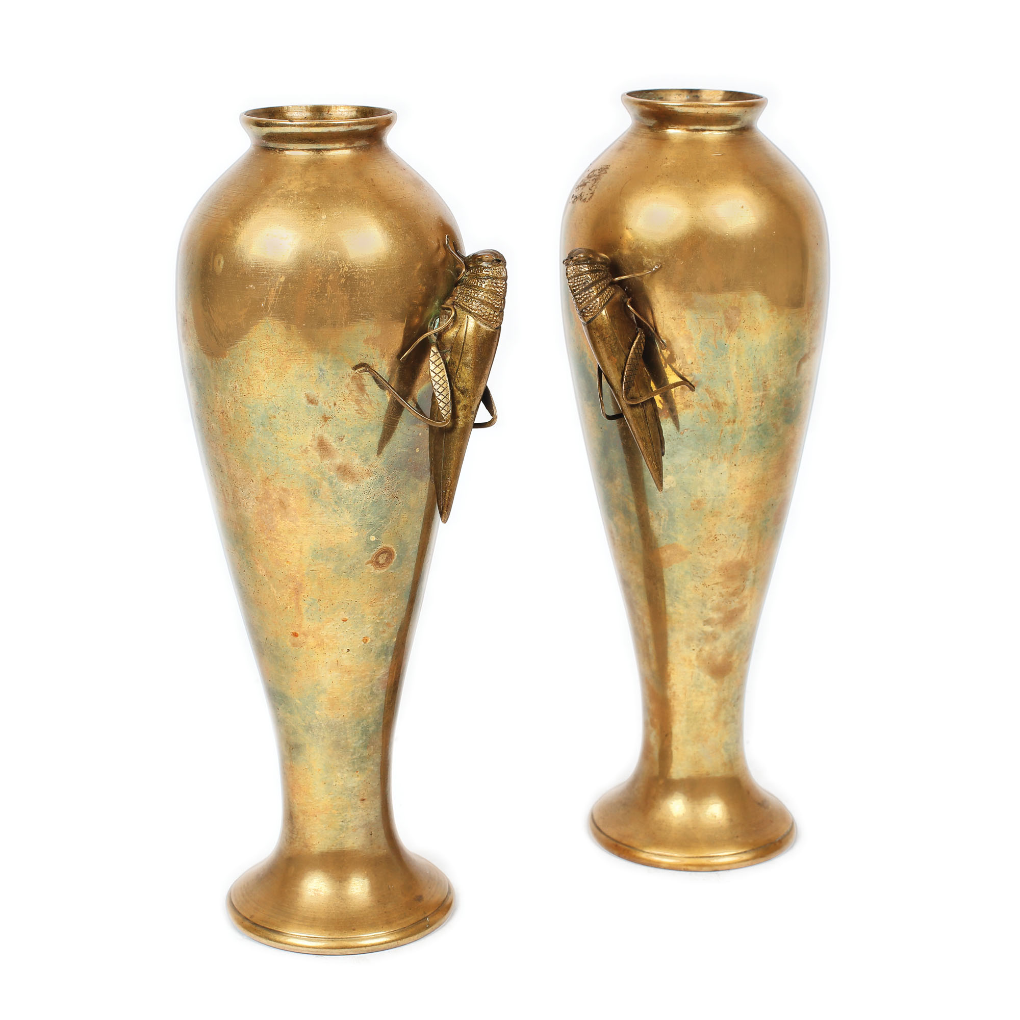 Pereche de soliflore din alamă, decorate cu lăcuste în ronde-bosse.