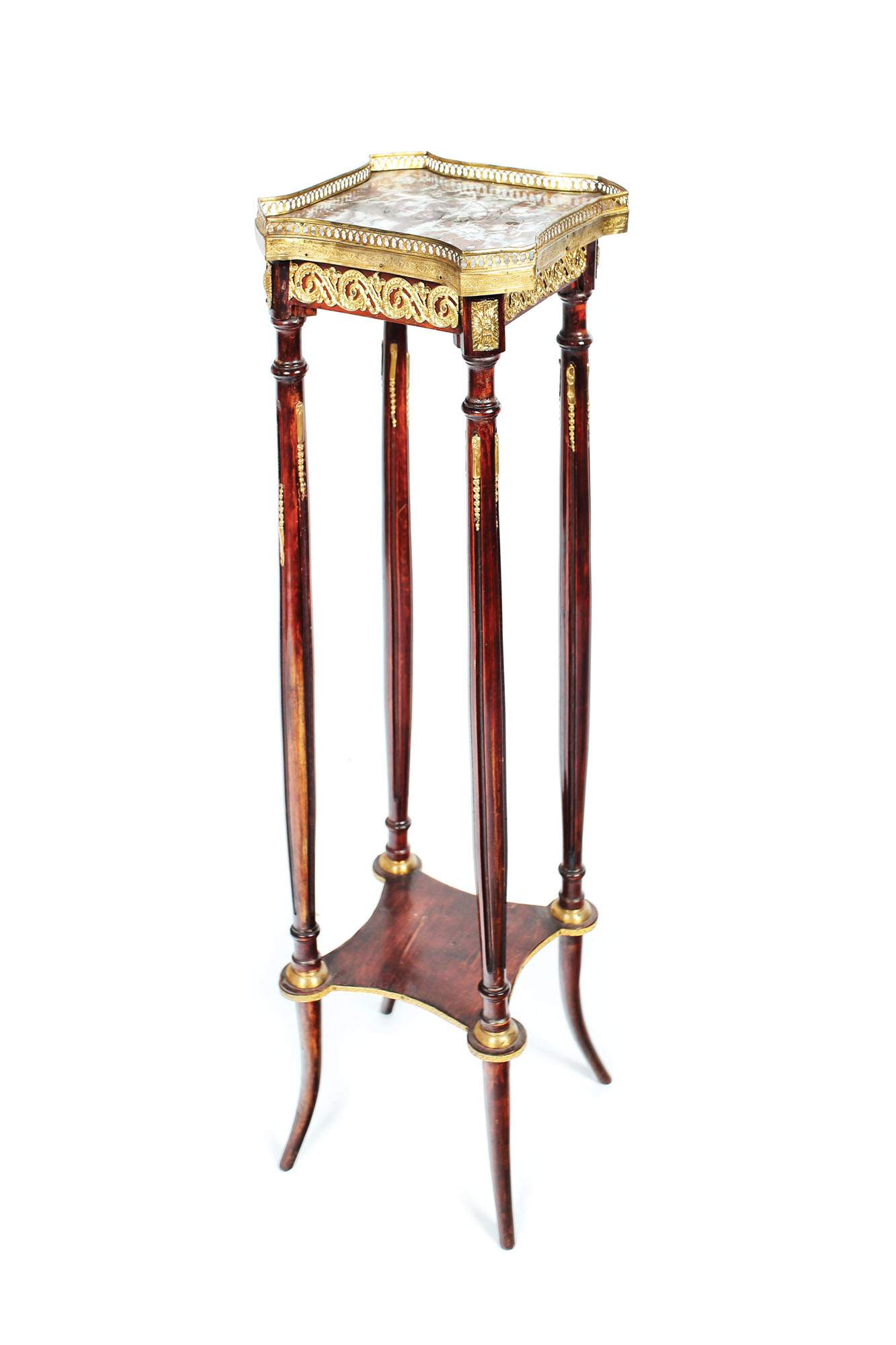 Piedestal înalt, pe patru picioare canelate, unite inferior de poliță, cu aplicații de alamă aurită decor de ghirlande vegetale, cu blat din marmură roșie cu venatură albă, fixat de manșon treiaj. În stil Louis XVI.