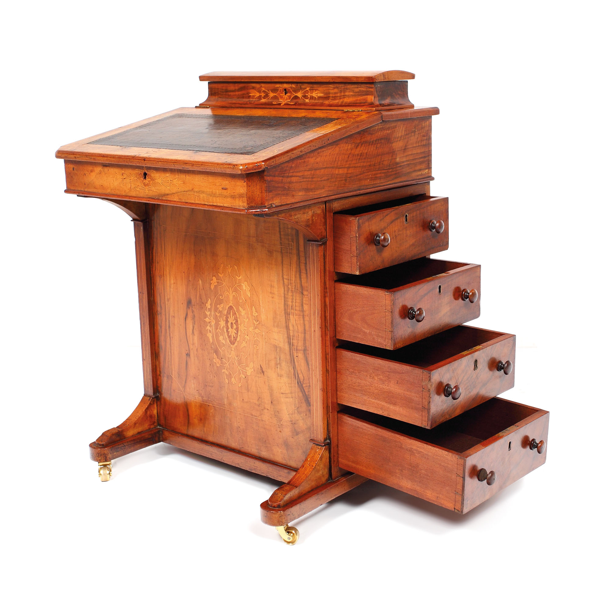 Pupitru pentru copii, pe rotile, cu câte patru sertare pe laterale, cu blat ce închide compartiment pentru rechizite, încoronat de compartiment pentru instrumente de scris. Furnirul din lemn de nuc e discret subliniat de elemente florale discrete, marchetate, amintind de mobilierul Biedermeier.