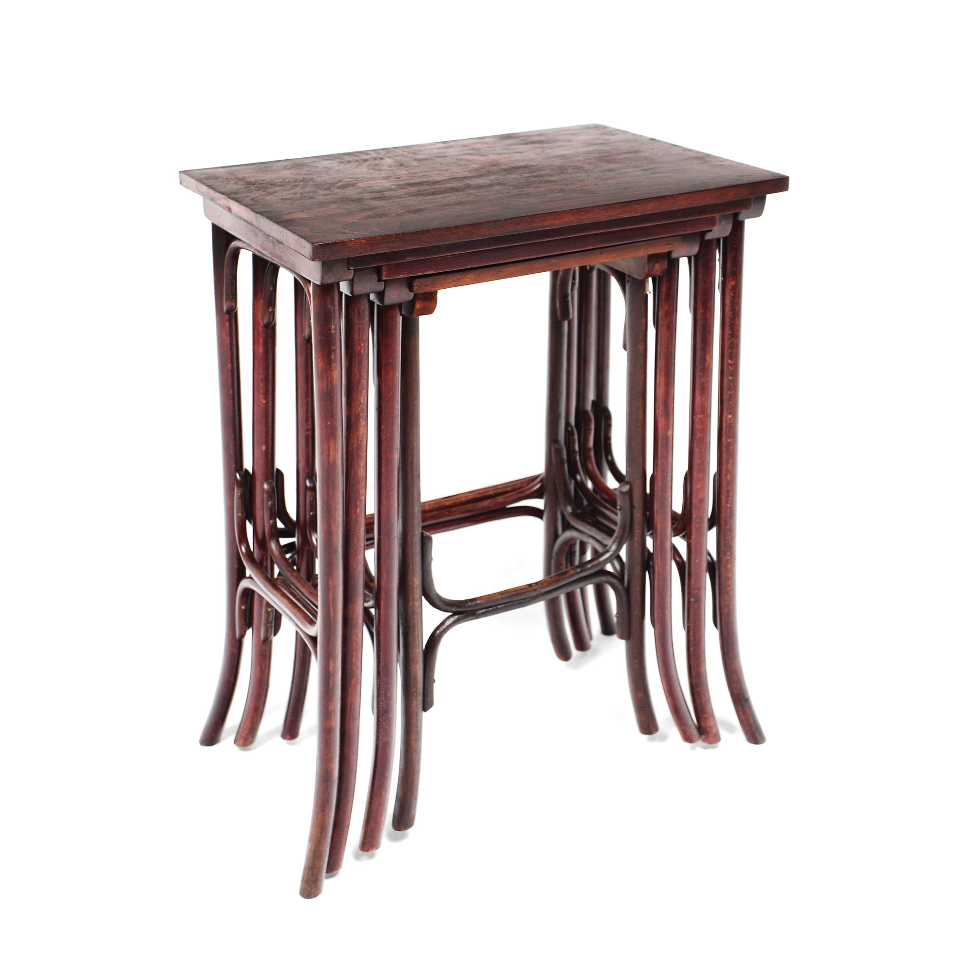 Set de măsuțe „gigogne”, patru măsuțe cu blaturi dreptunghiulare susţinute de picioare elansate unite prin traverse. În stil Sezession.