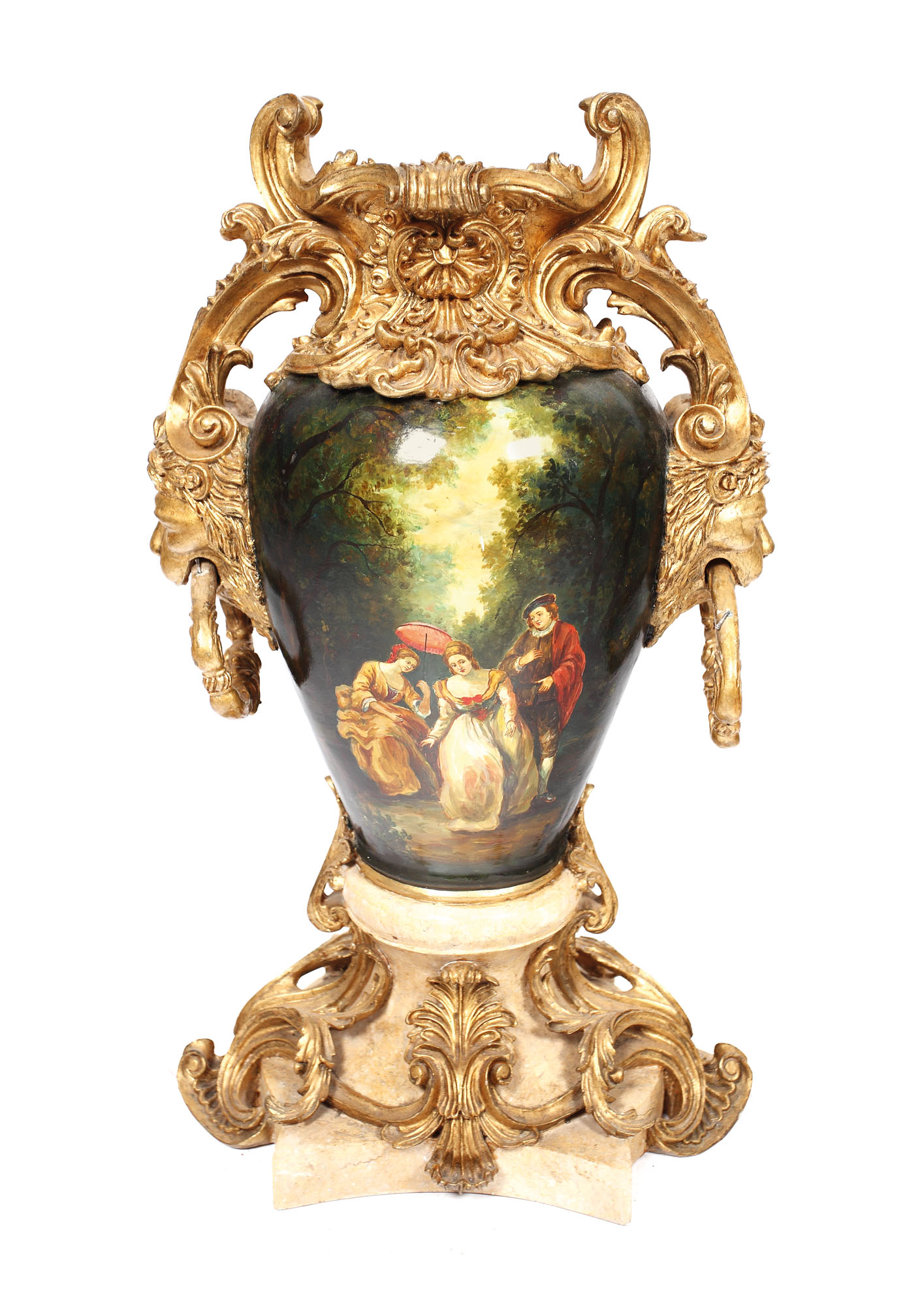 Vas mare decorativ, cu bază cu decor de volute vegetale, corp pictat pe întreaga suprafață cu scenă galantă în peisaj (în manieră Lancret), cu aplicații capete de lei susținând mânere anouri și gât bogat decorat cu motive vegetale rococo, aurite.