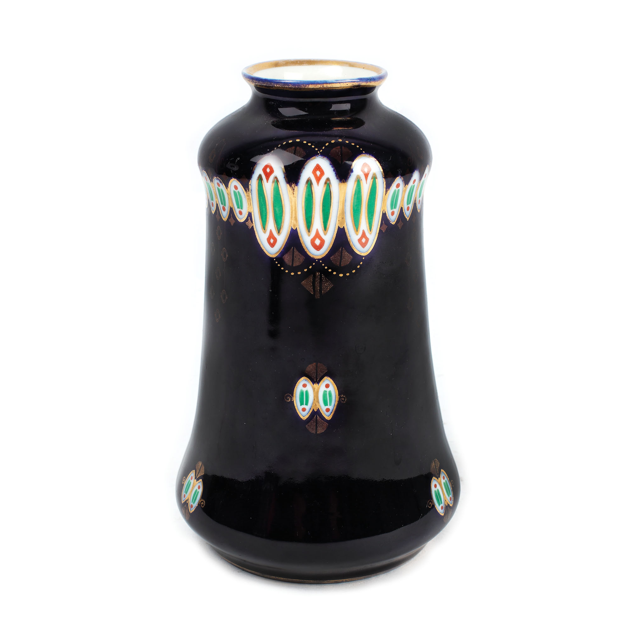 Vas de formă tubulară, îngustat spre buză, pe fond cobalt, cu decor geometric mărunt și sublinieri de aur. În stil Jugendstil.