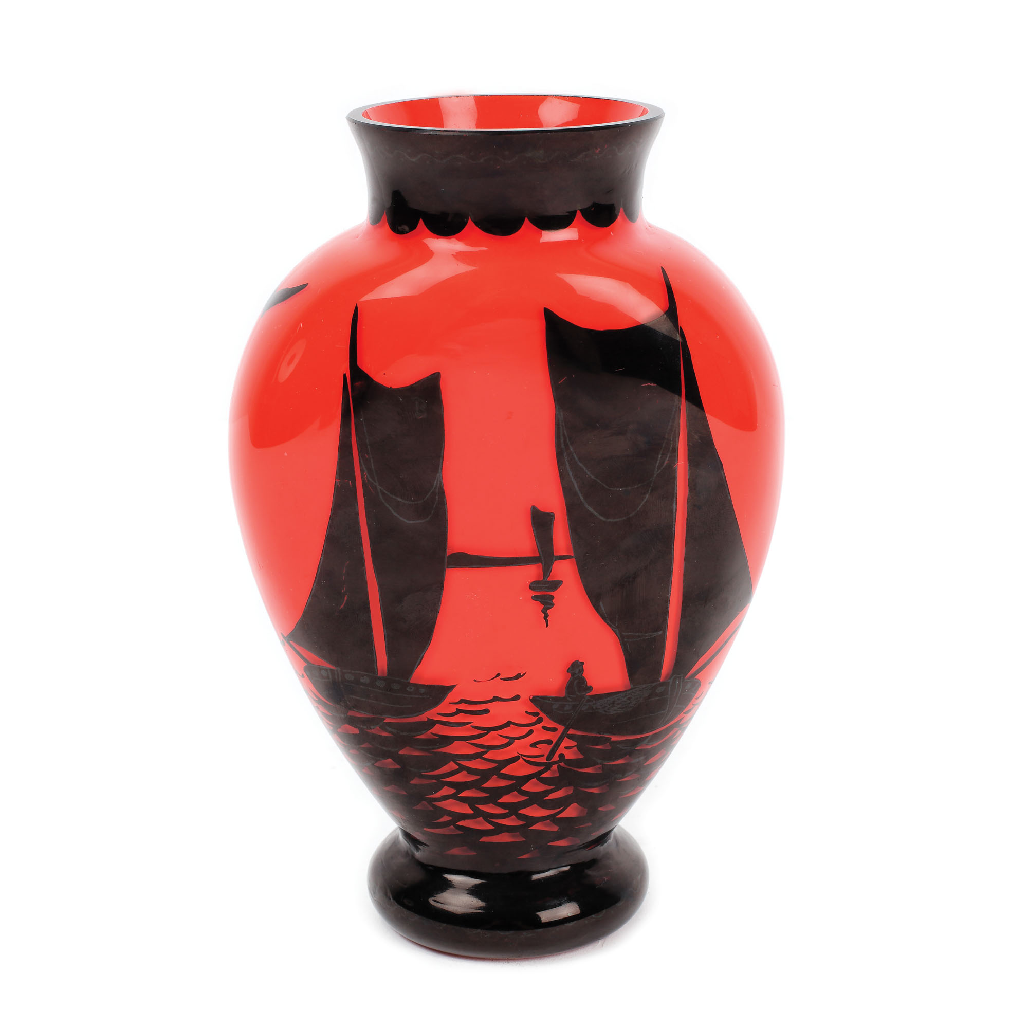 Vas aplaltizat, cu decor de ambarcațiuni pe lac, pe fon roșu orange. În stil Art Deco.