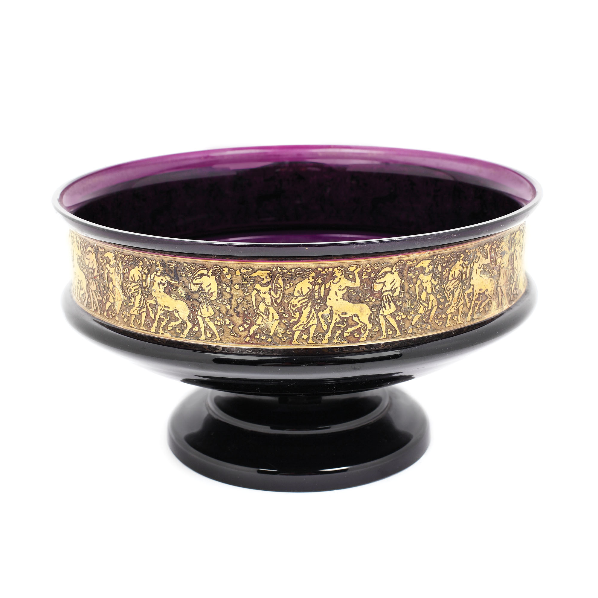 Cupă largă, pe picior mărunt, din sticlă colorată în violet intens, cu friză decorativă la partea superioară, model „Cortegiul amazoanelor”, marcă a stilului Art Deco la atelierul Moser.