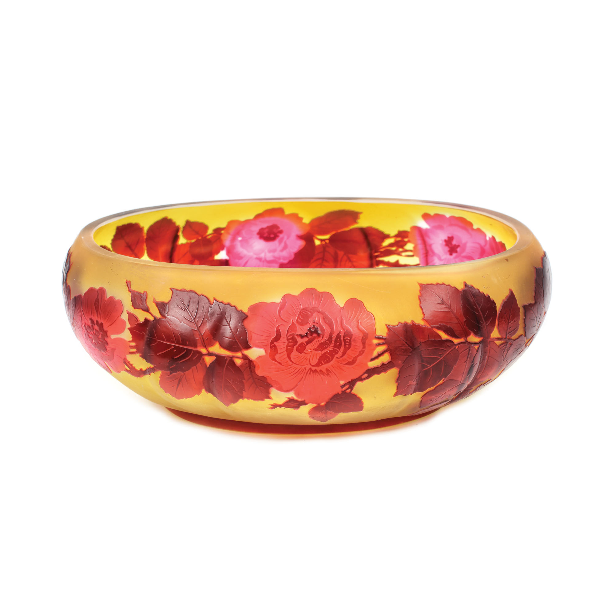Cupă adâncă, ovoidală (jardinieră cu talpă redusă), corp modelat cu lobi ușor gofrați; decor de ghirlandă cu trandafiri sălbatici, rubinie pe fond galben. Forma vasului rar întâlnită la Gallé. Semnat cu rubiniu prin gravare.