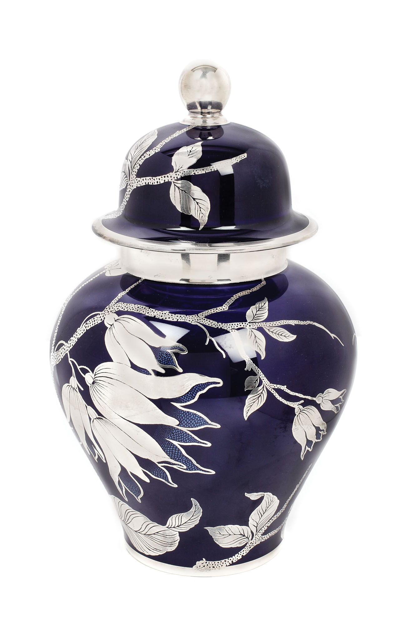 Vas din porțelan, cu capac, de tipologie chineză, cu suprafața glazurată cu albastru cobalt și decor bogat de aplicații din argint, reprezentând ramuri de magnolie. Capac detașabil cu buton.
