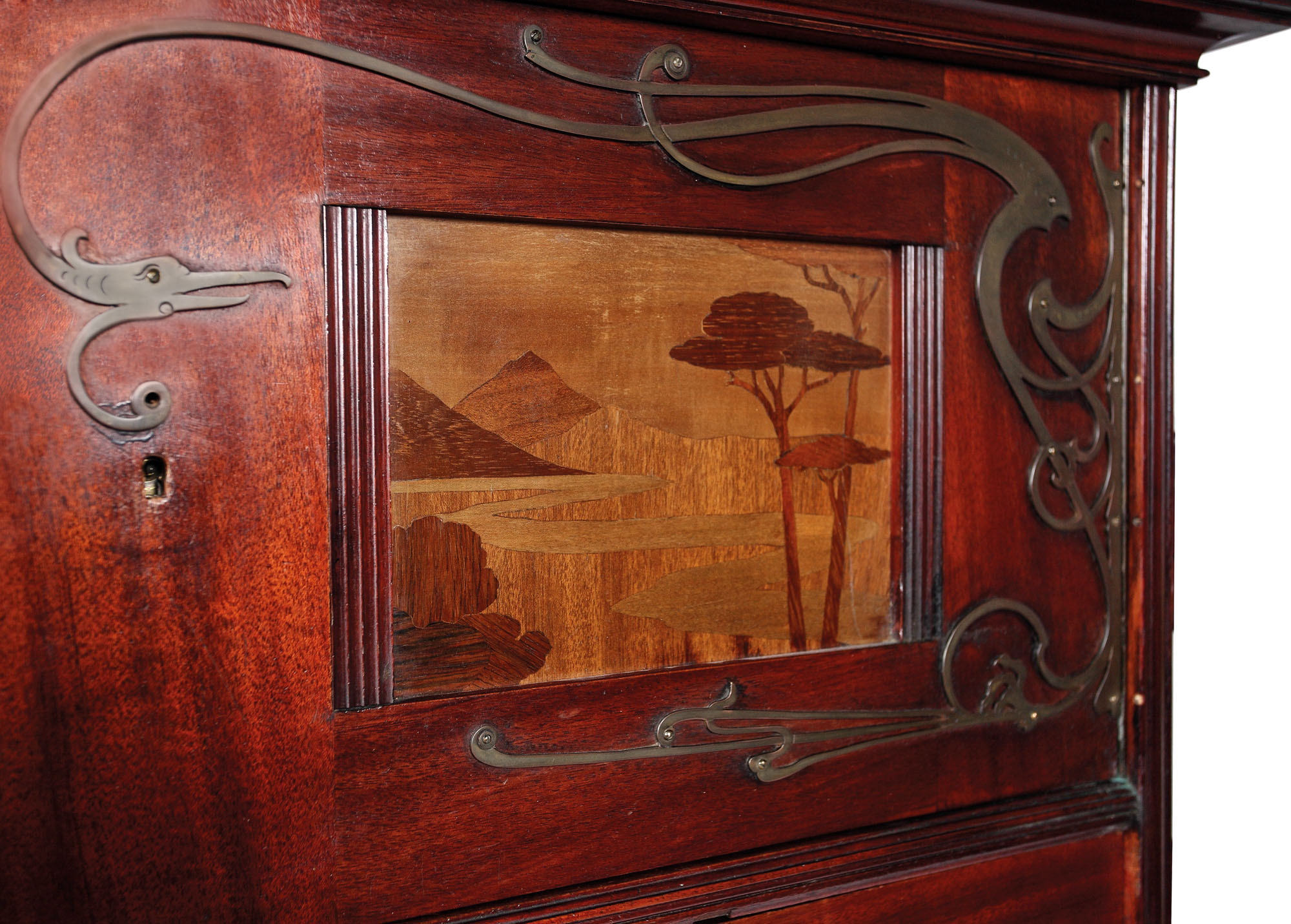 Vitrină cu corp central sprijinit pe picioare, cu poliță centrală, flancat de sertare, la partea superioară cu dulăpaș închis cu ușă cu peisaj convențional intarsiat. Flancat lateral de corpuri-vitrine, închise cu uși din cristal, cu modele sugerând frunze, din pâte de verre . Aplicații de alamă motive vegetale stilizate. În stil Jugendstil.