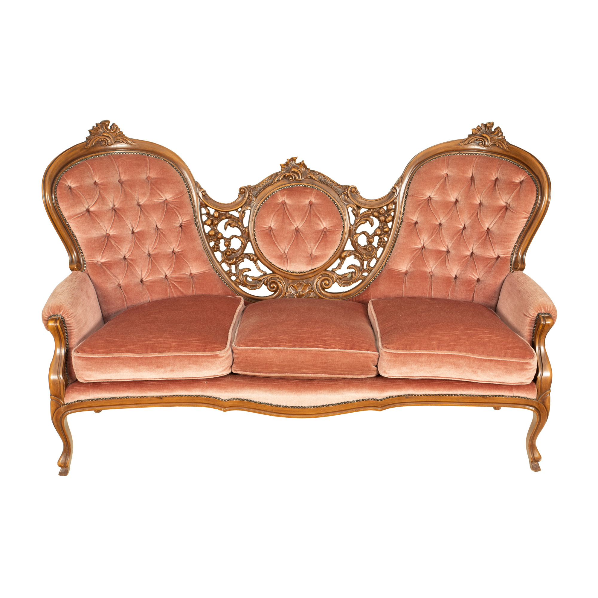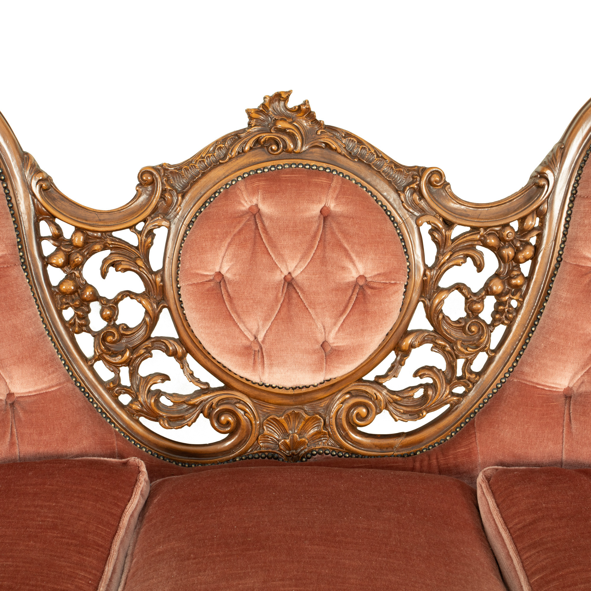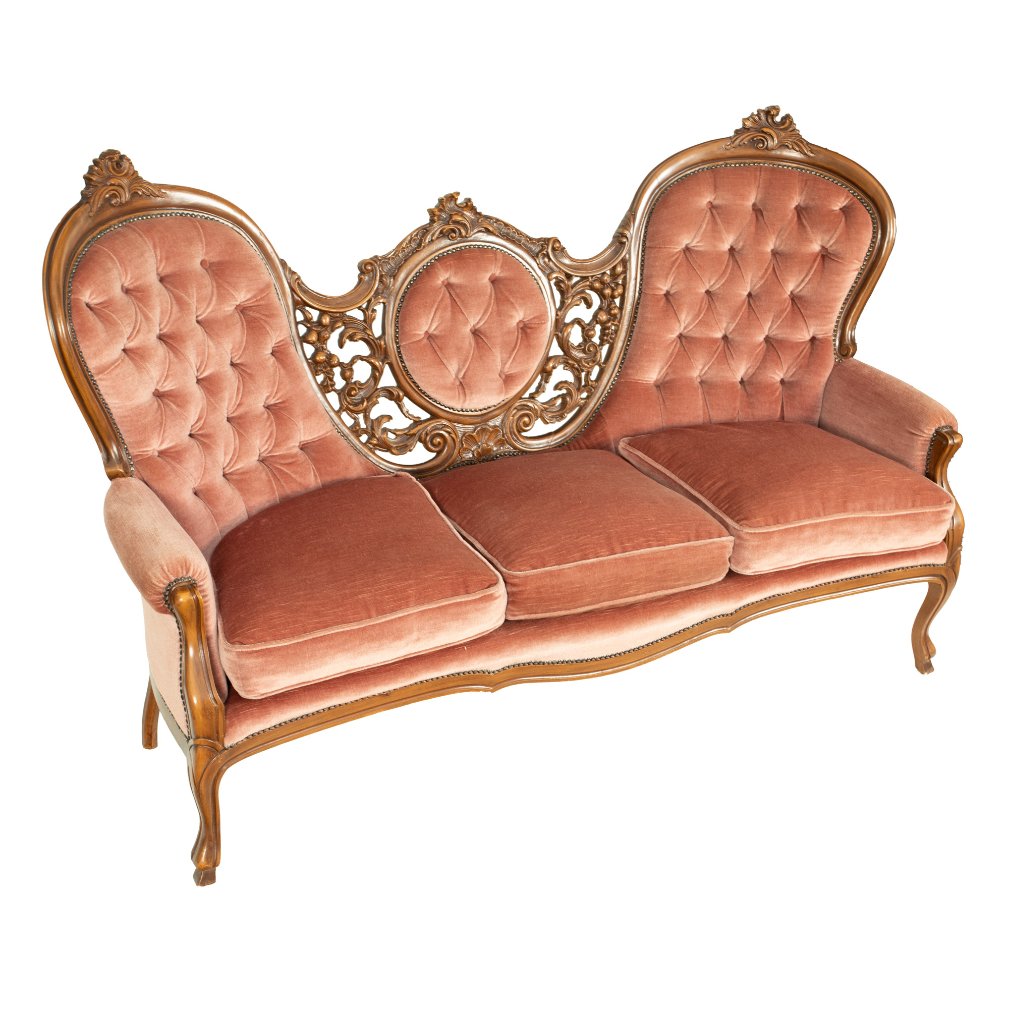 110. Canapea în manieră Neo-Rococo, din lemn de nuc și tapițerie din catifea roz pudră [mijlocul sec. XX]