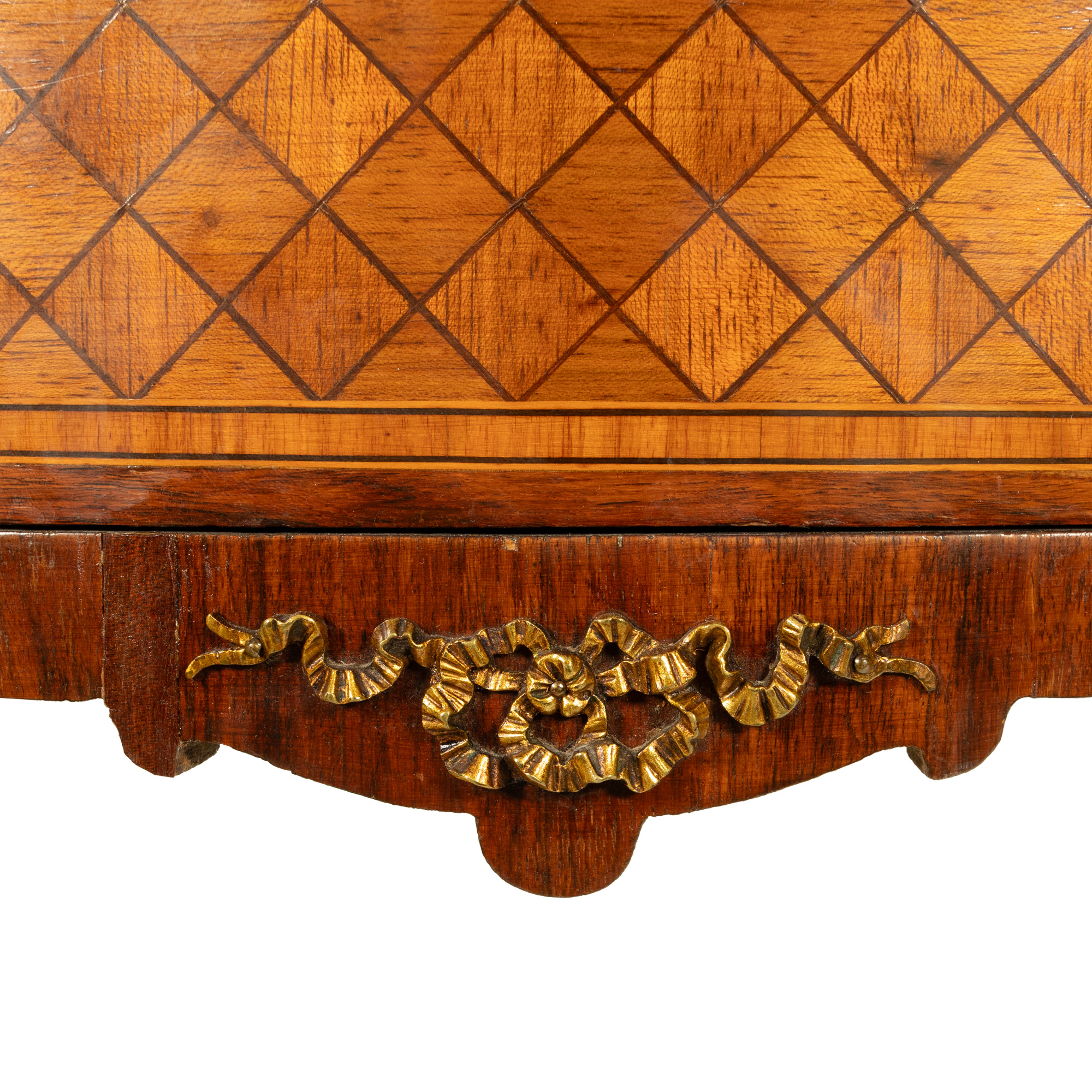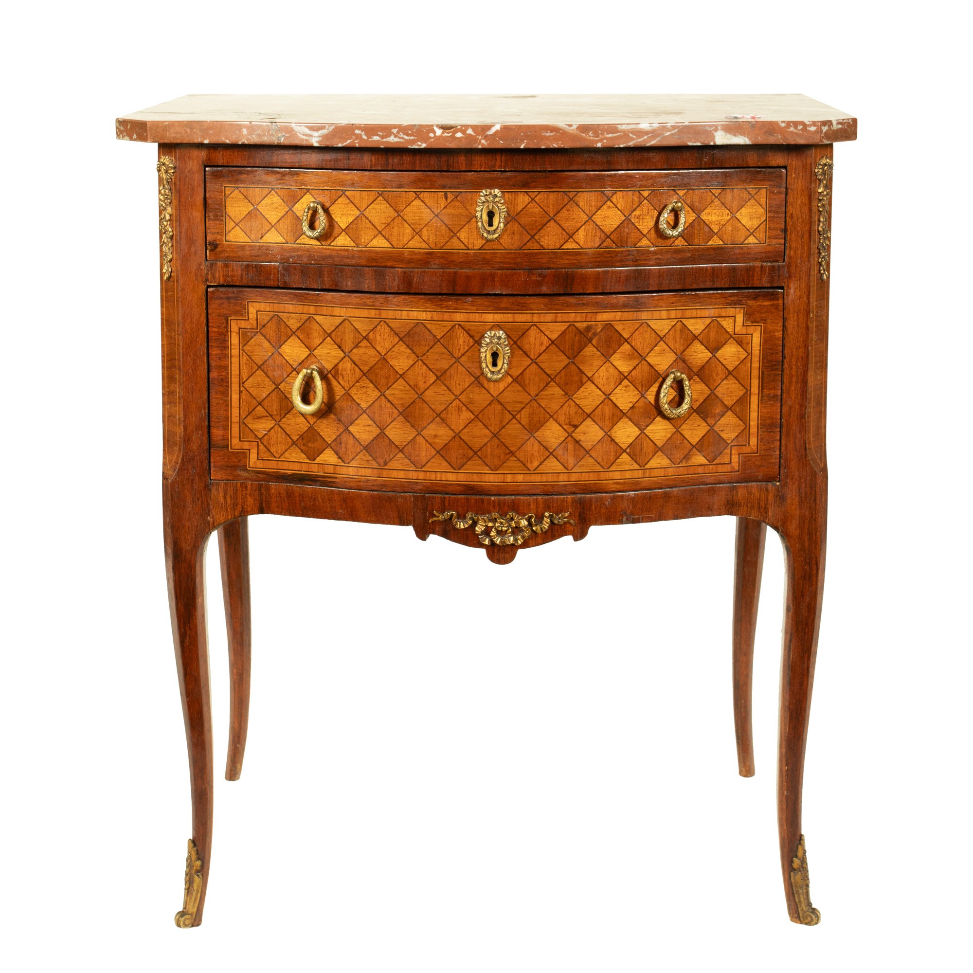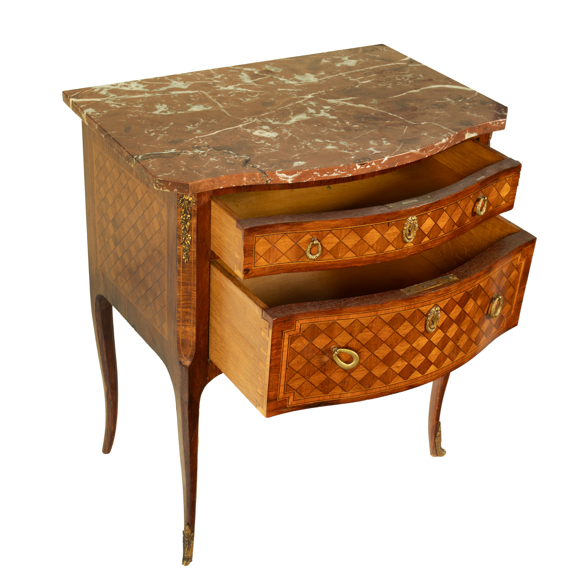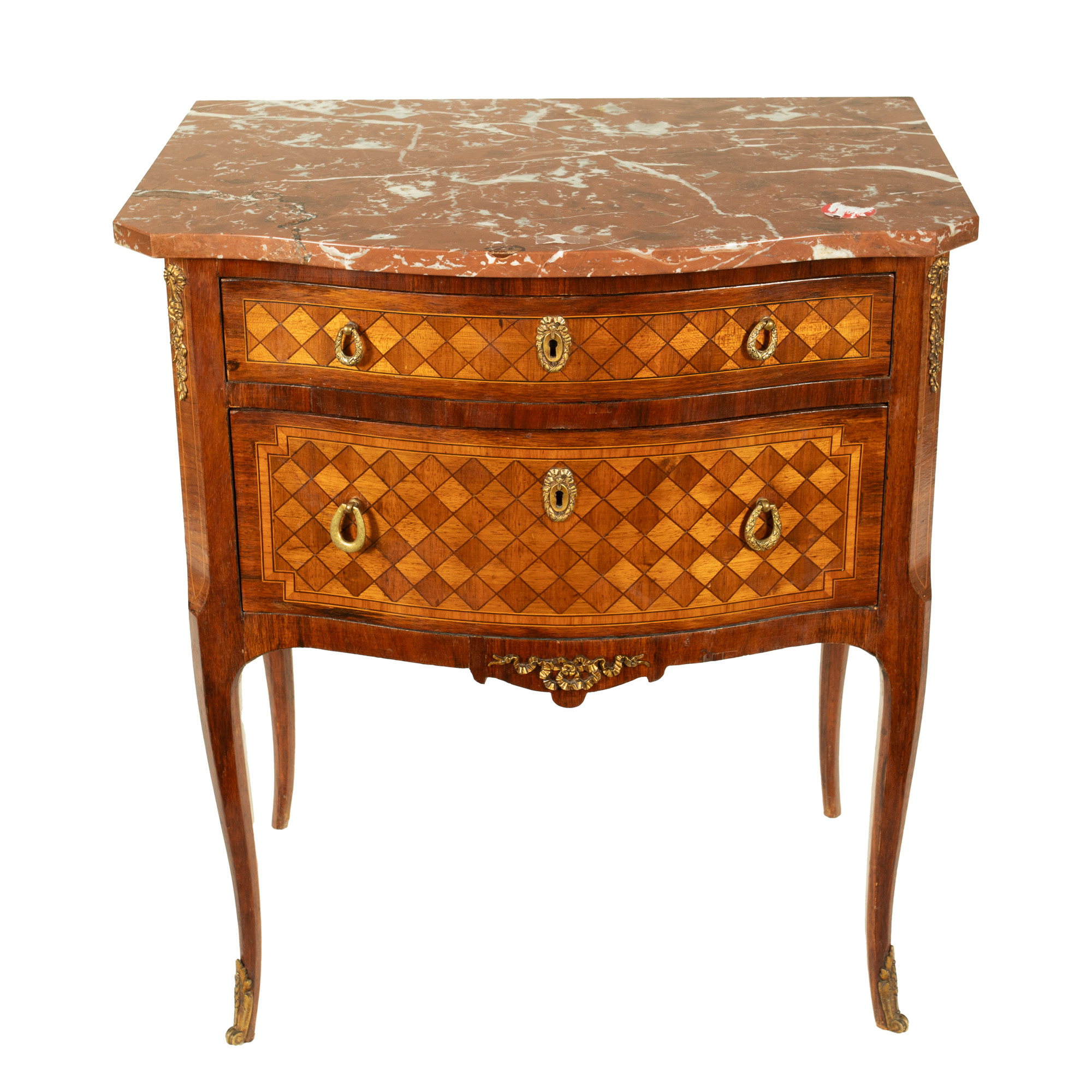69. Comodă în manieră Louis XV, ornată cu decor geometric marchetat și blat de marmură, începutul sec. XX