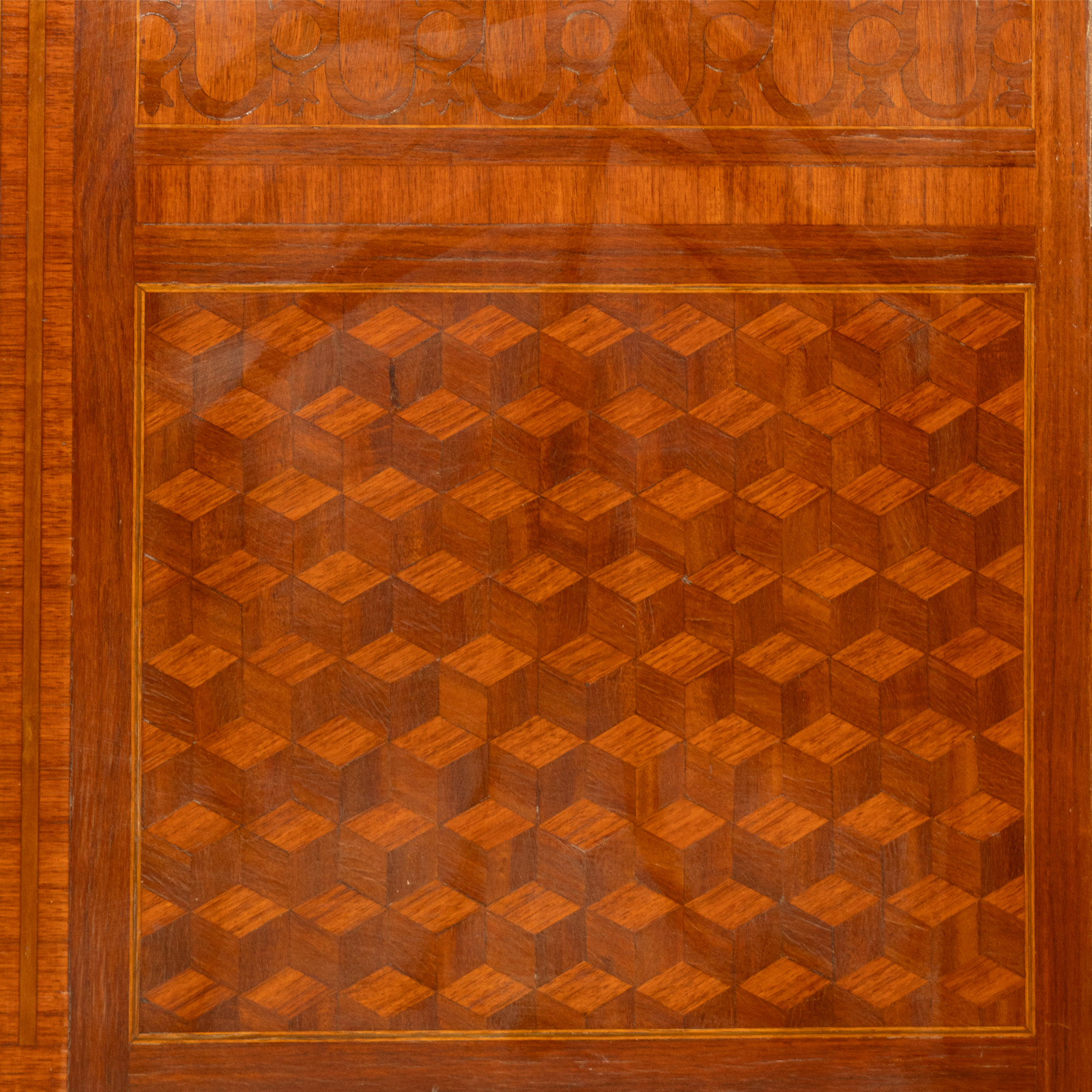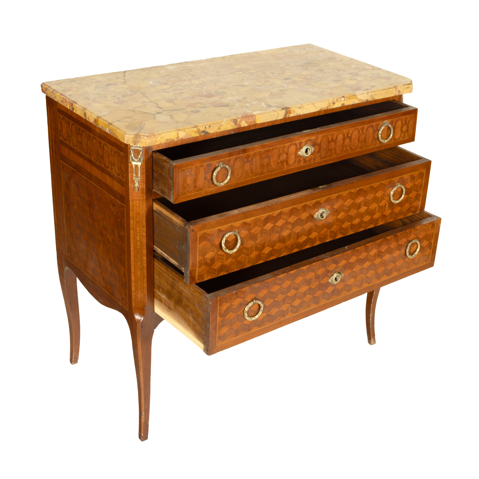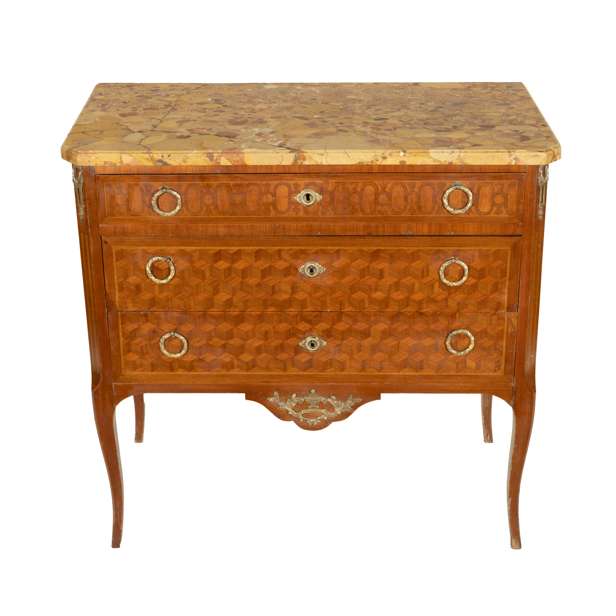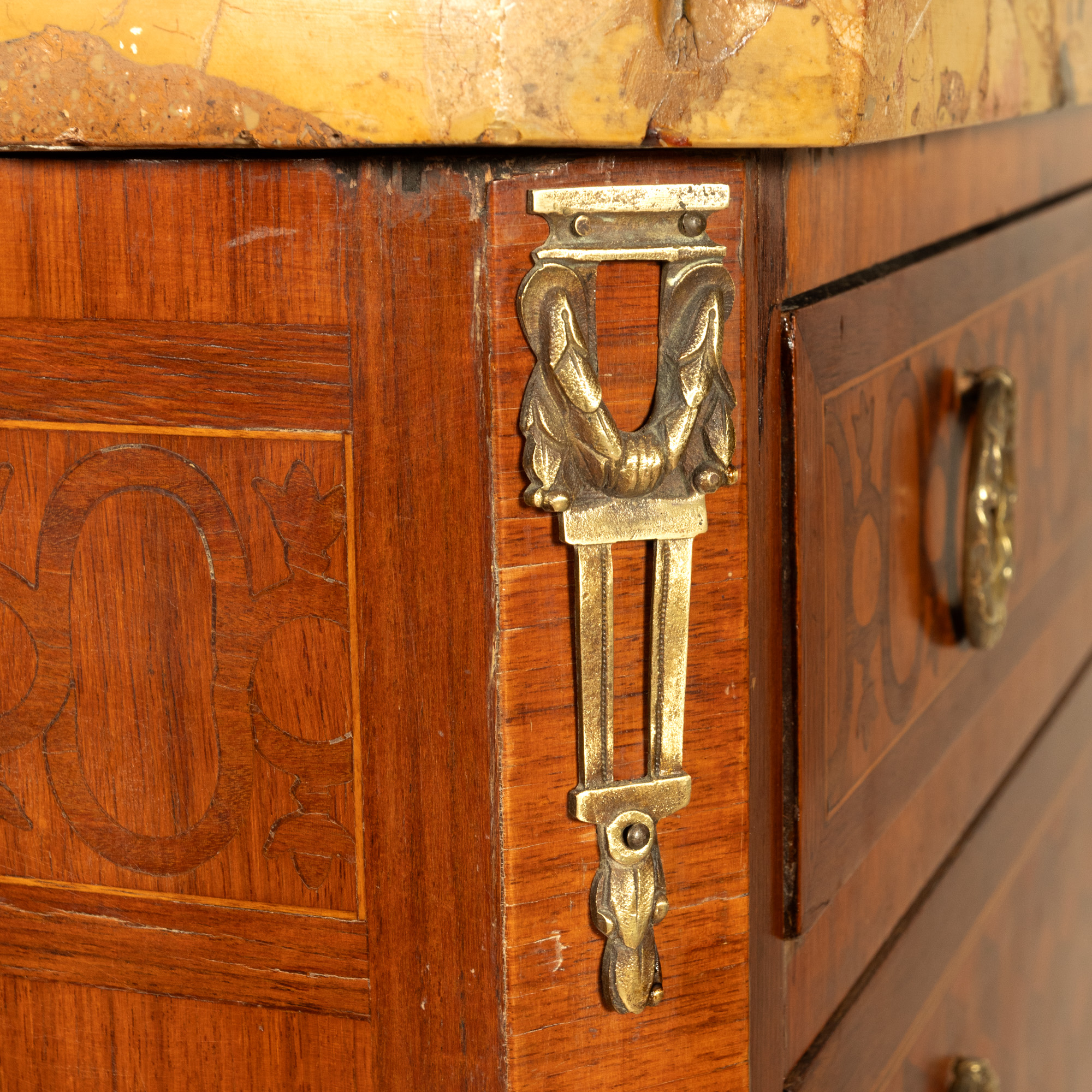 86. Comodă Transition Revival, cu marchetărie geometrică și blat din marmură, începutul sec. XX