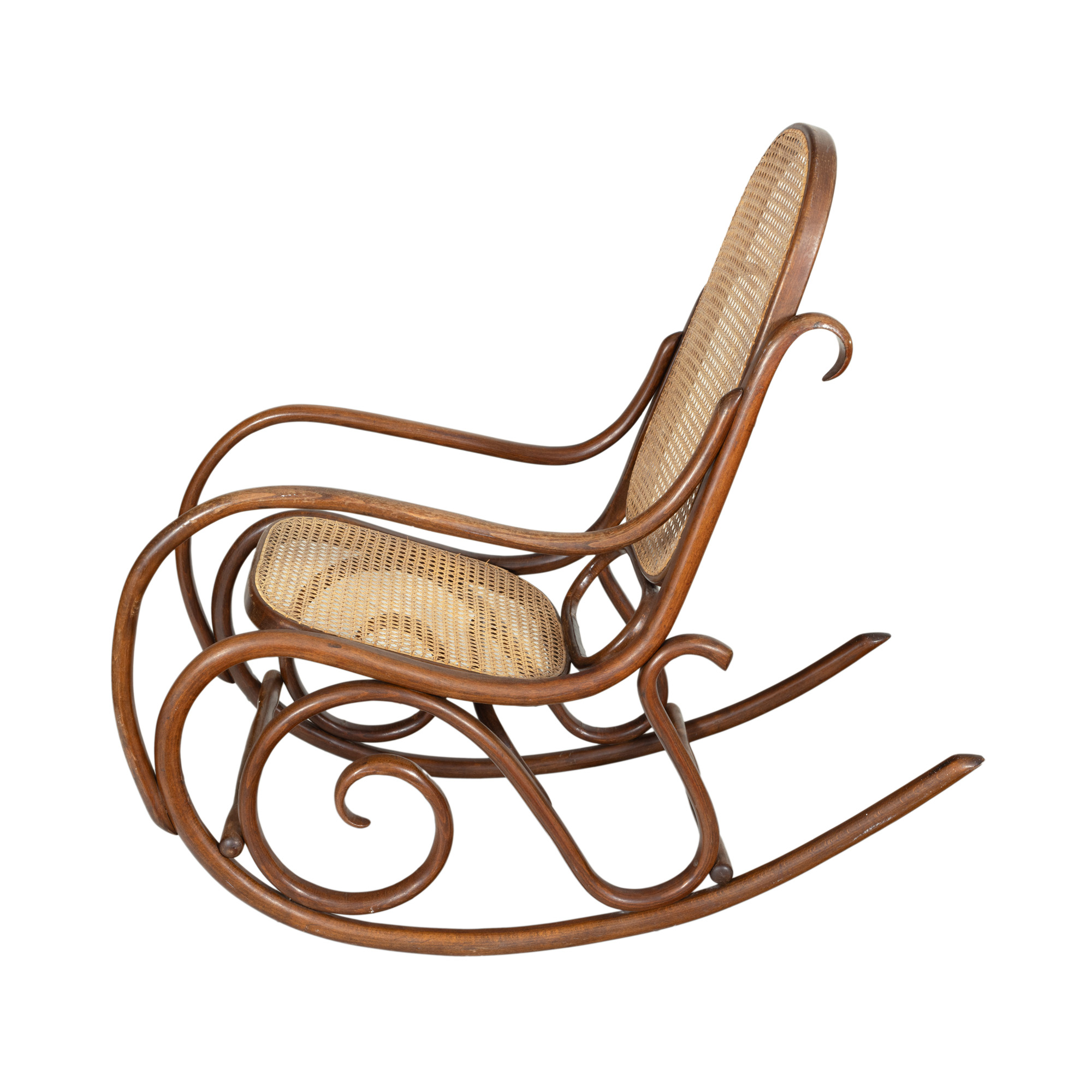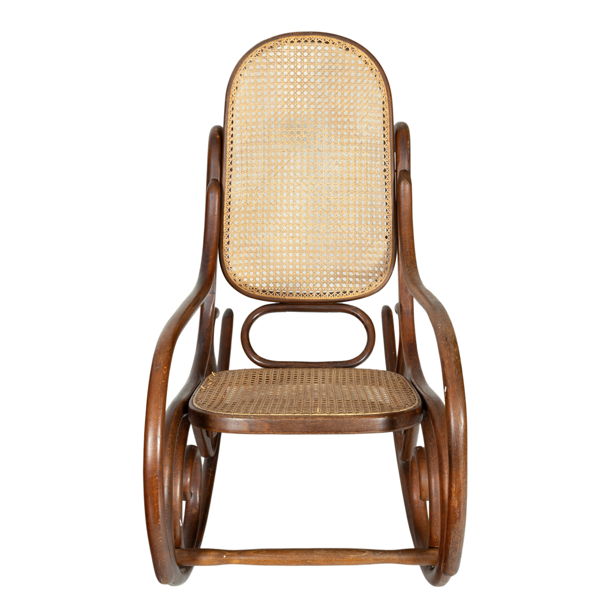 10. Fotoliu-balansoar în manieră Thonet, din lemn de nuc și împletitură de paie de orez, mijlocul sec. XX