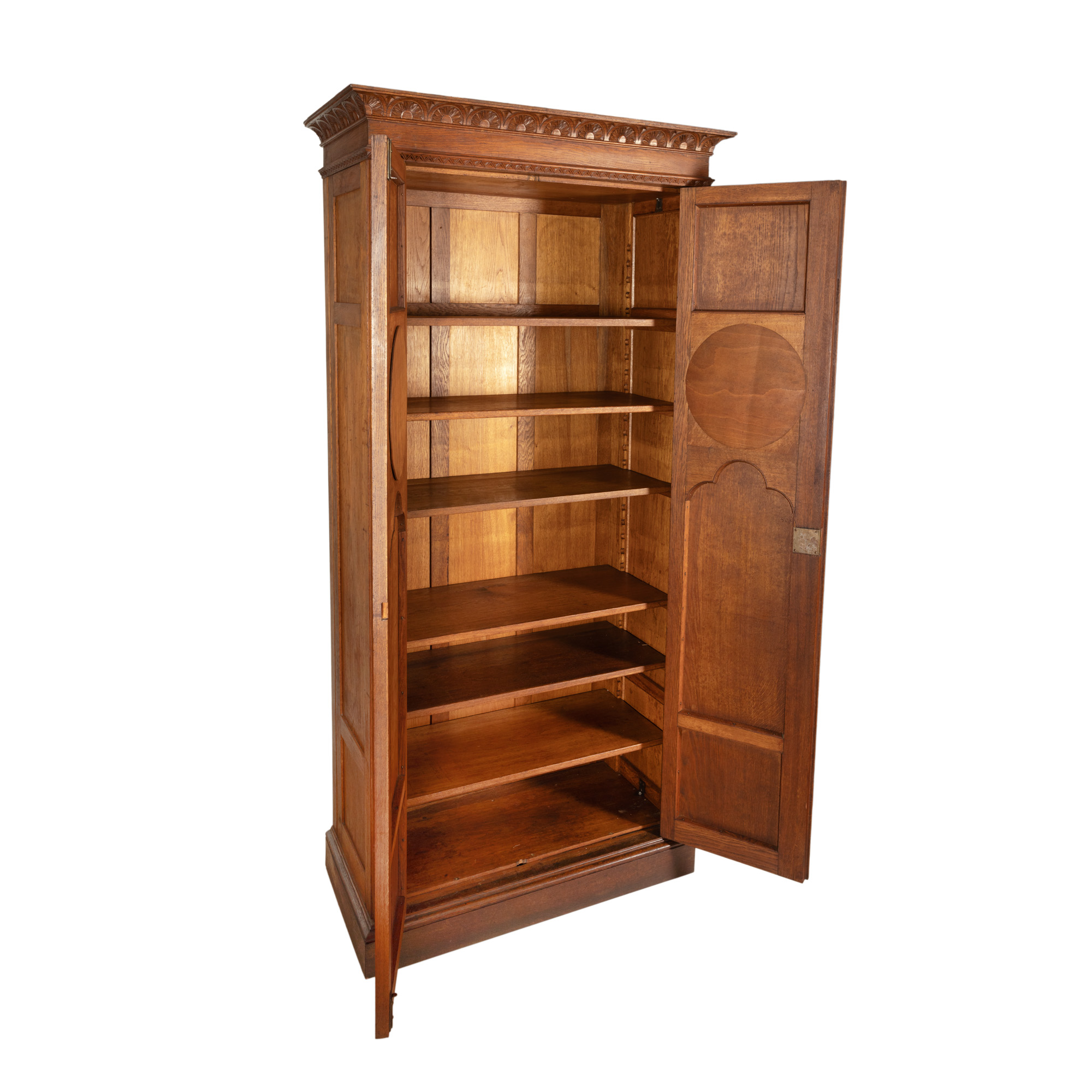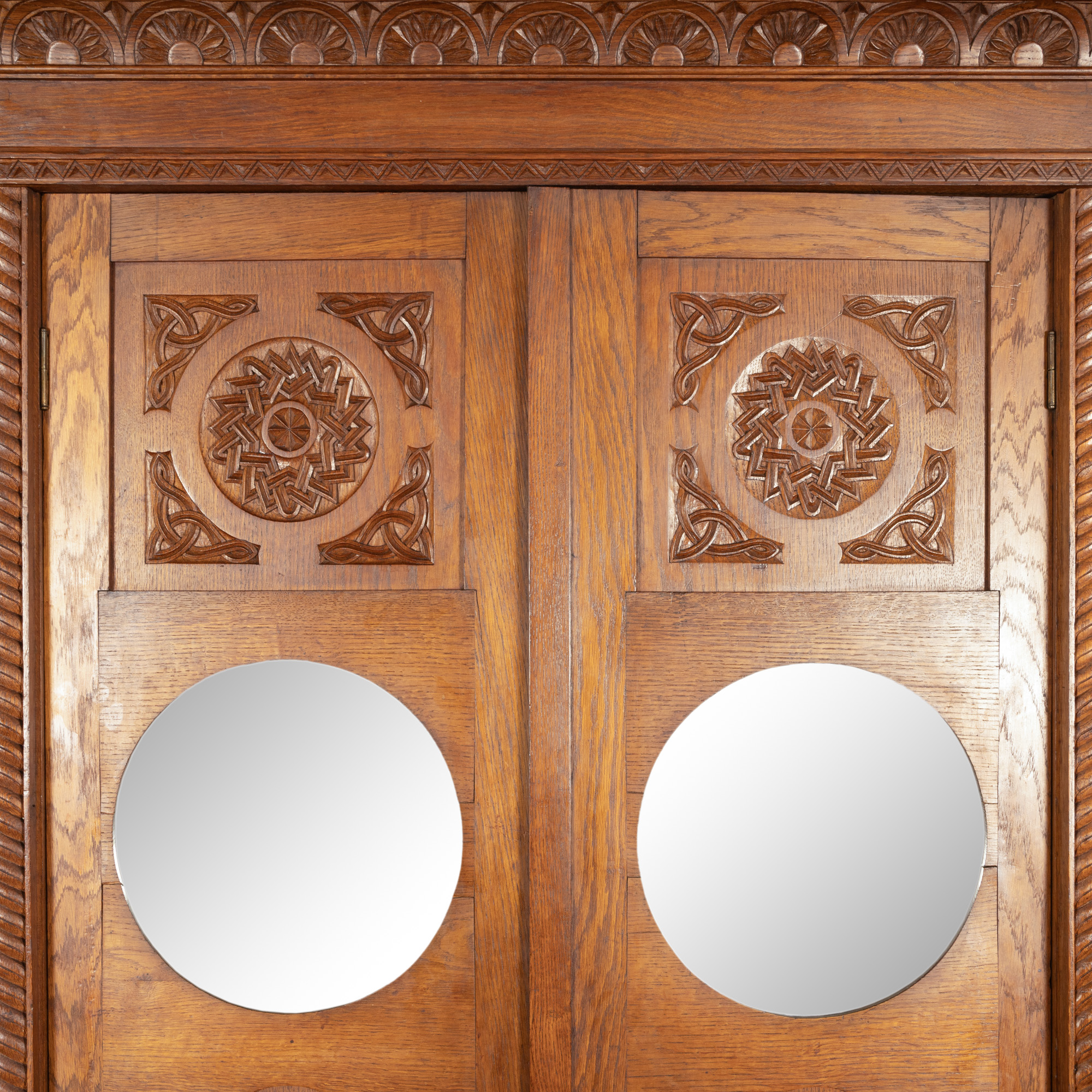 18. Impresionant armoar sculptat în stil Neo-Brâncovenesc, decorat cu motive solare, prima jumătate a sec. XX