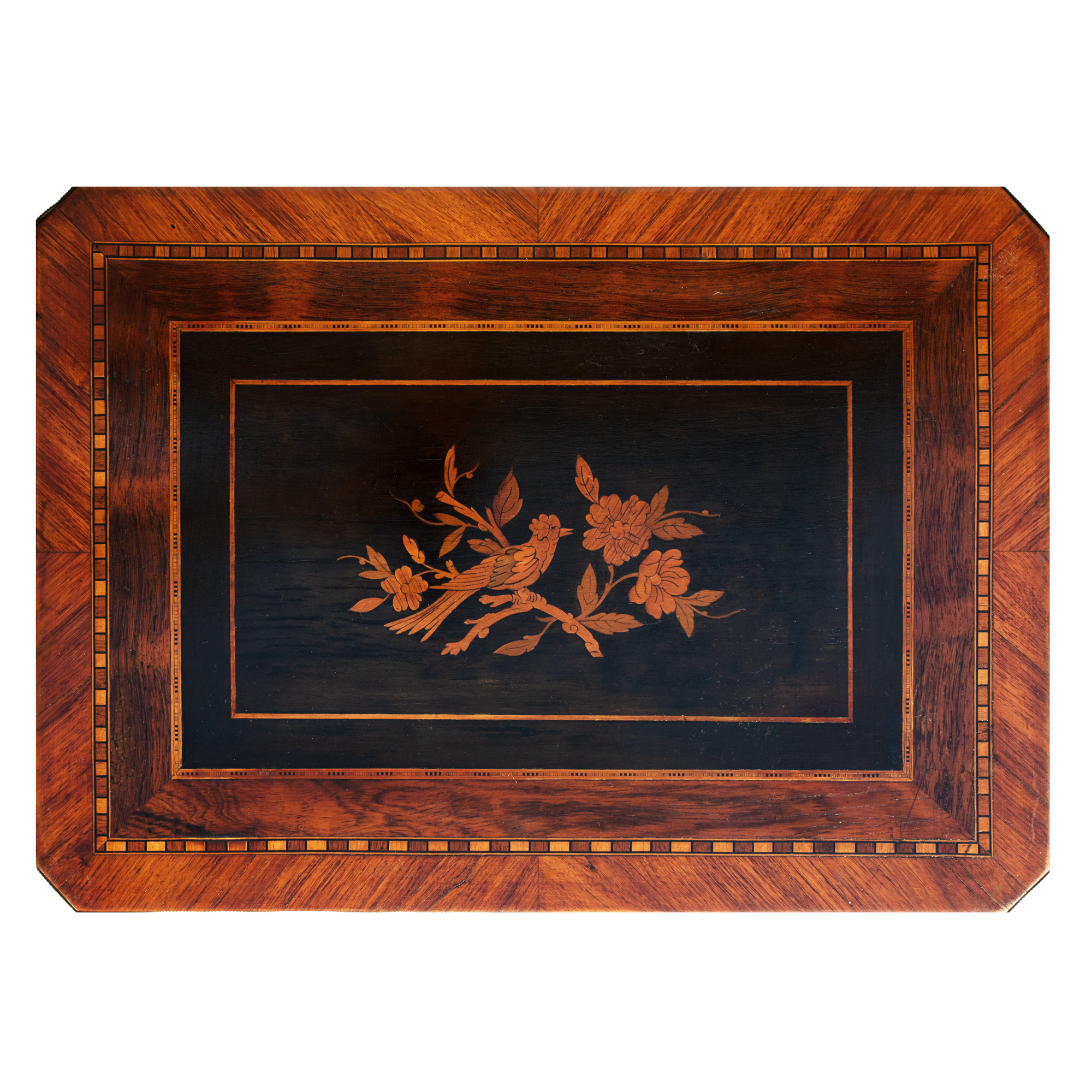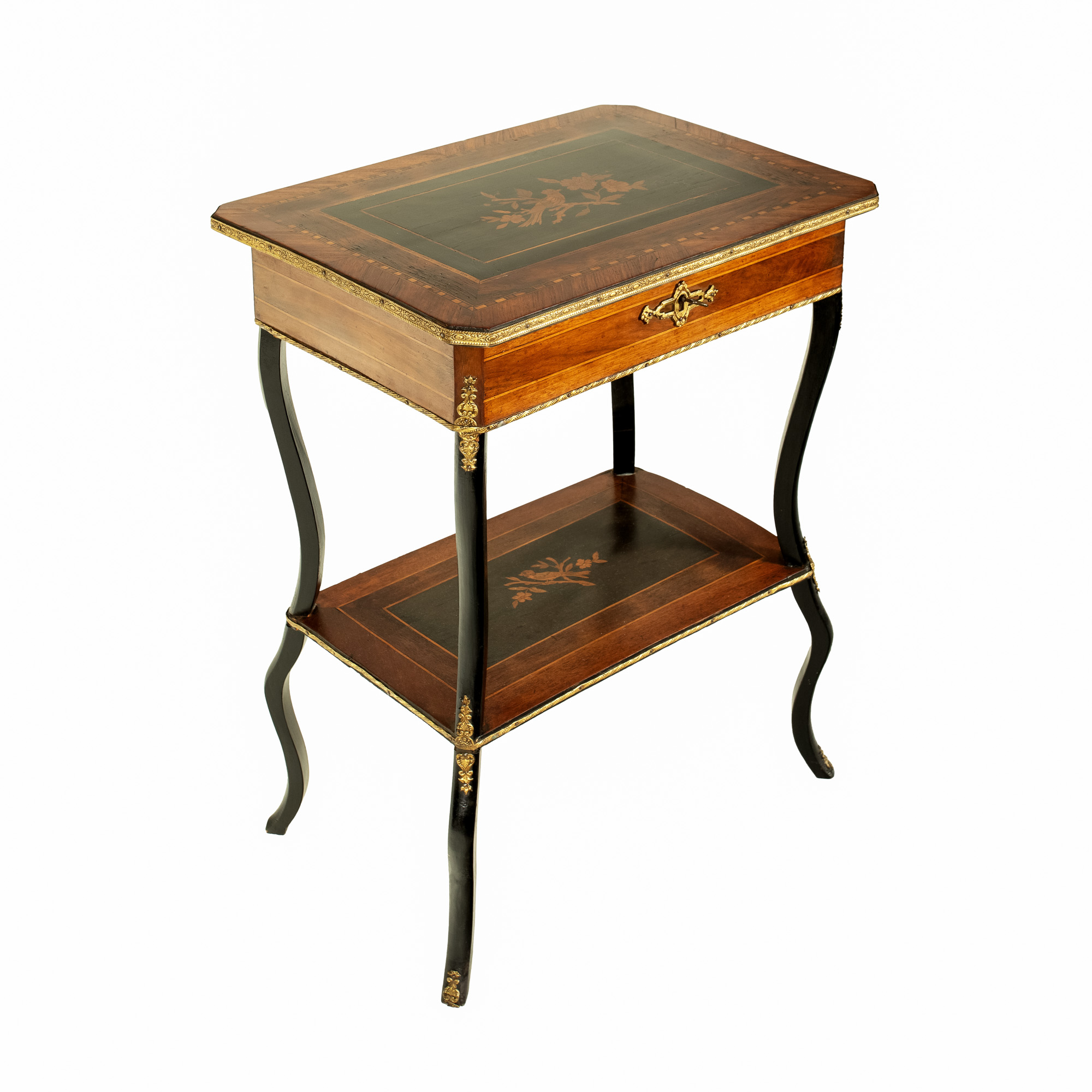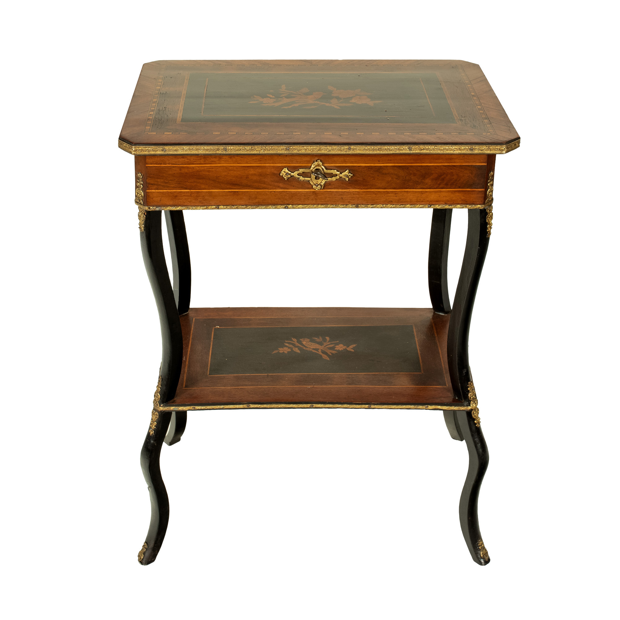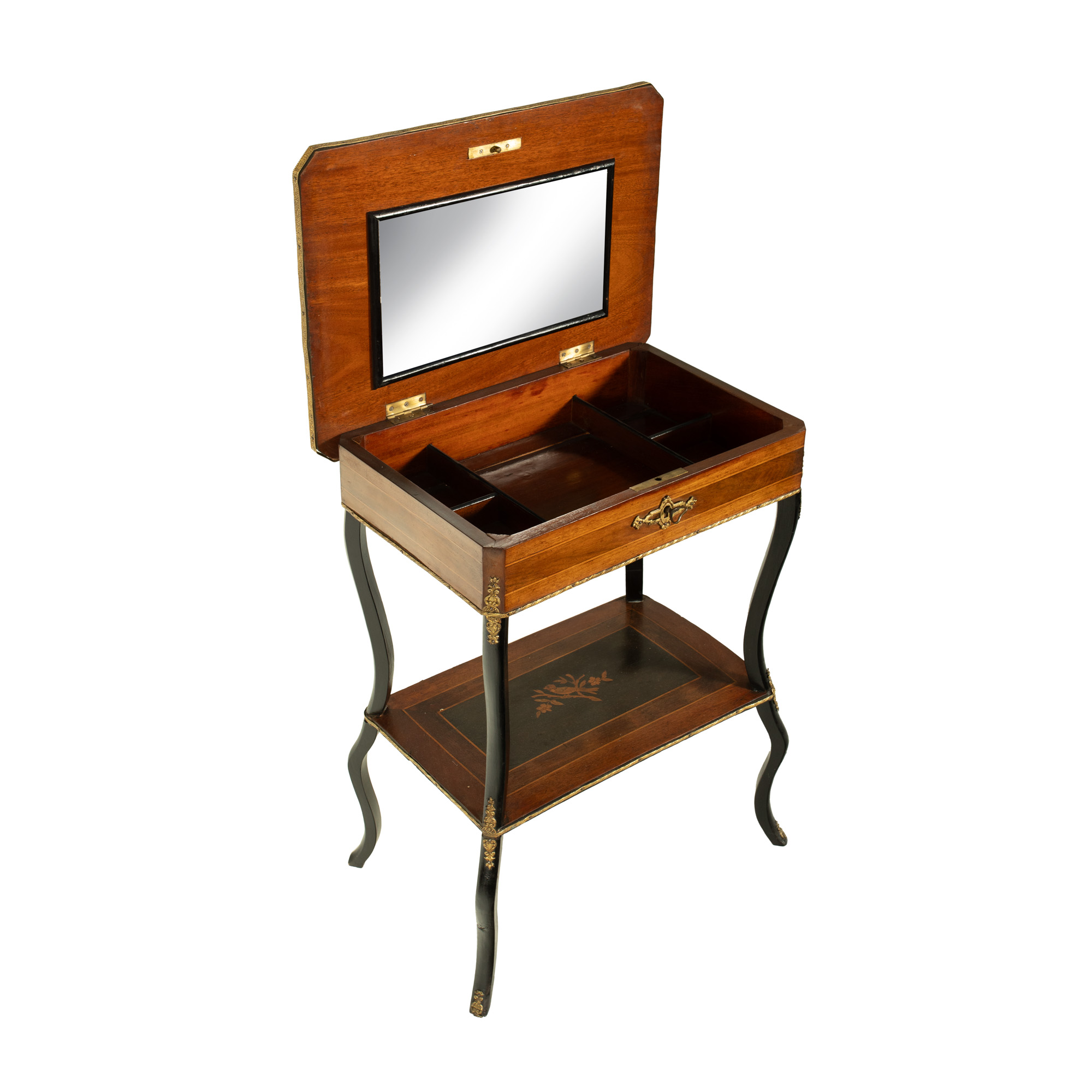 113. Măsuță de toaletă în manieră Napoleon III, din lemn ebenizat, intarsiată, cca. 1920