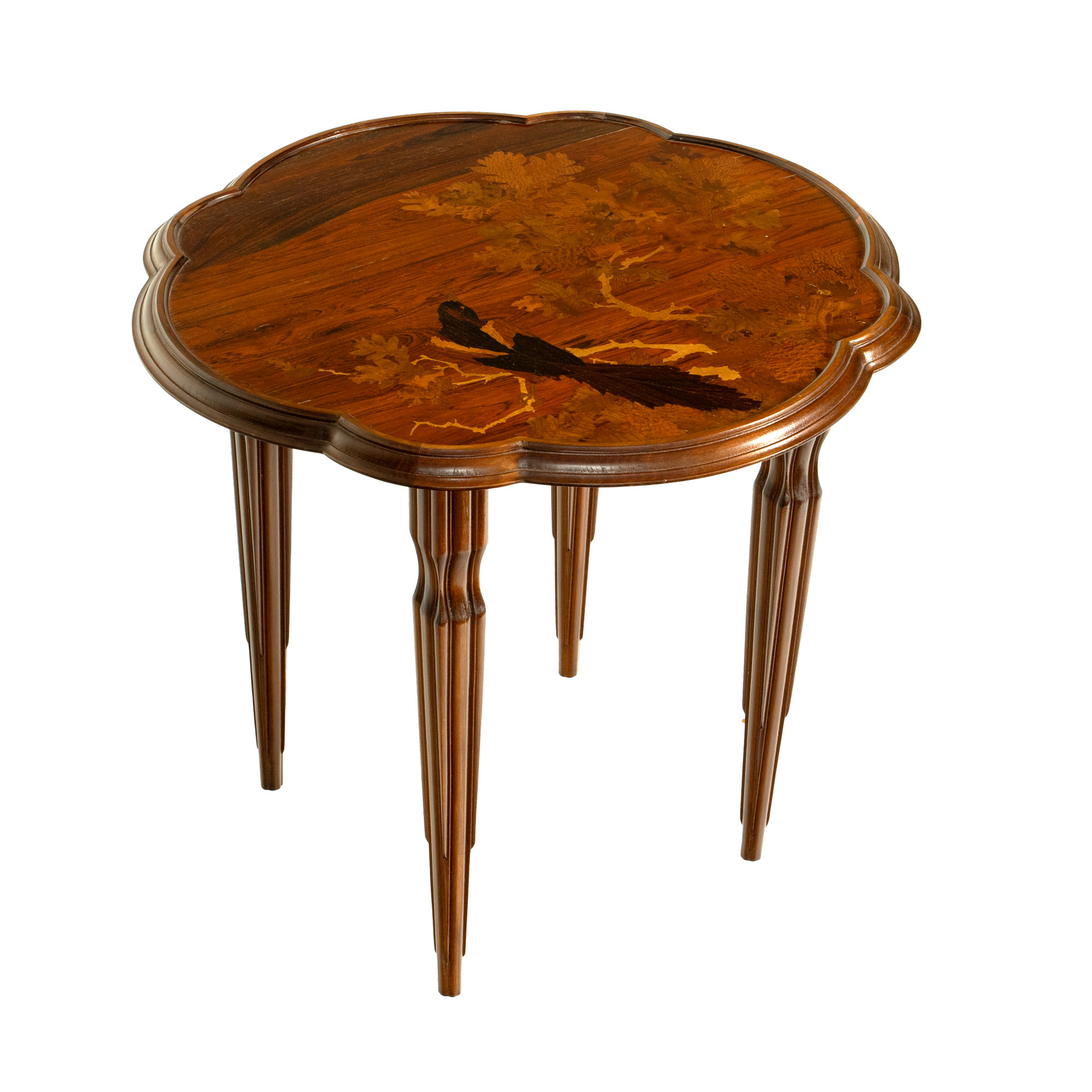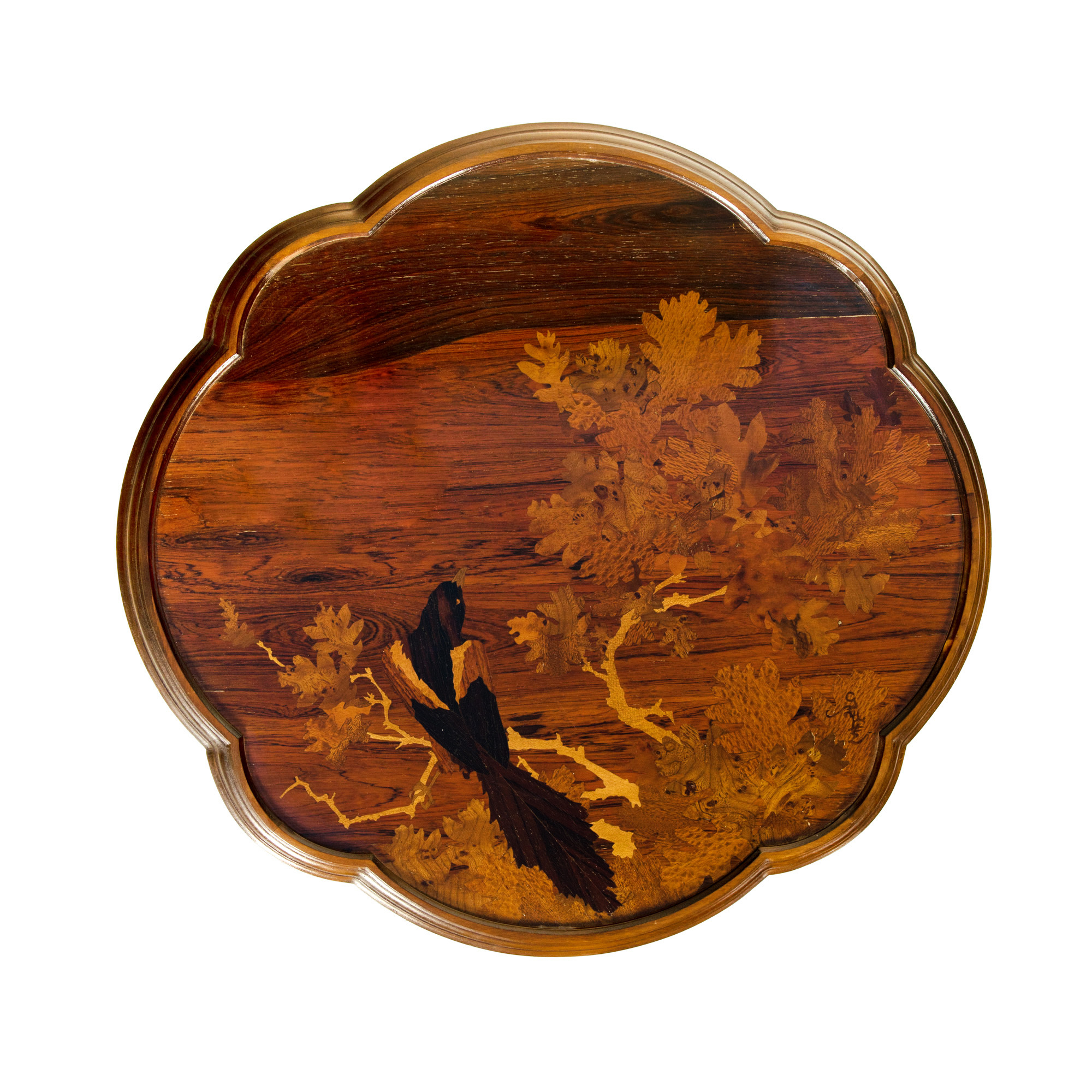 20. Măsuță Émile Gallé, din lemn intarsiat, decorată cu frunze de stejar și corb, cca. 1900