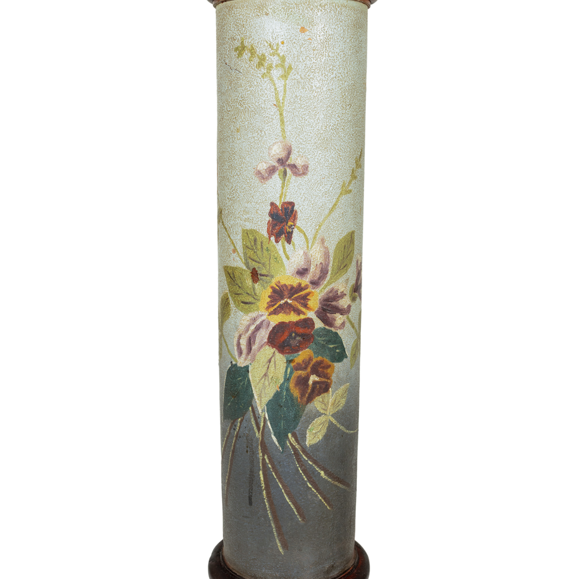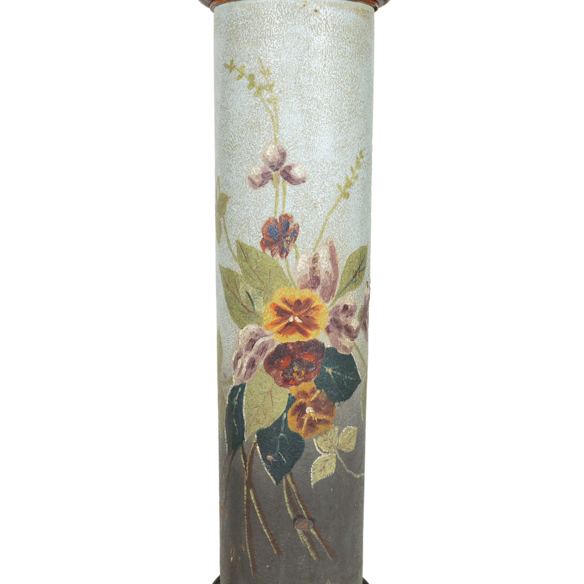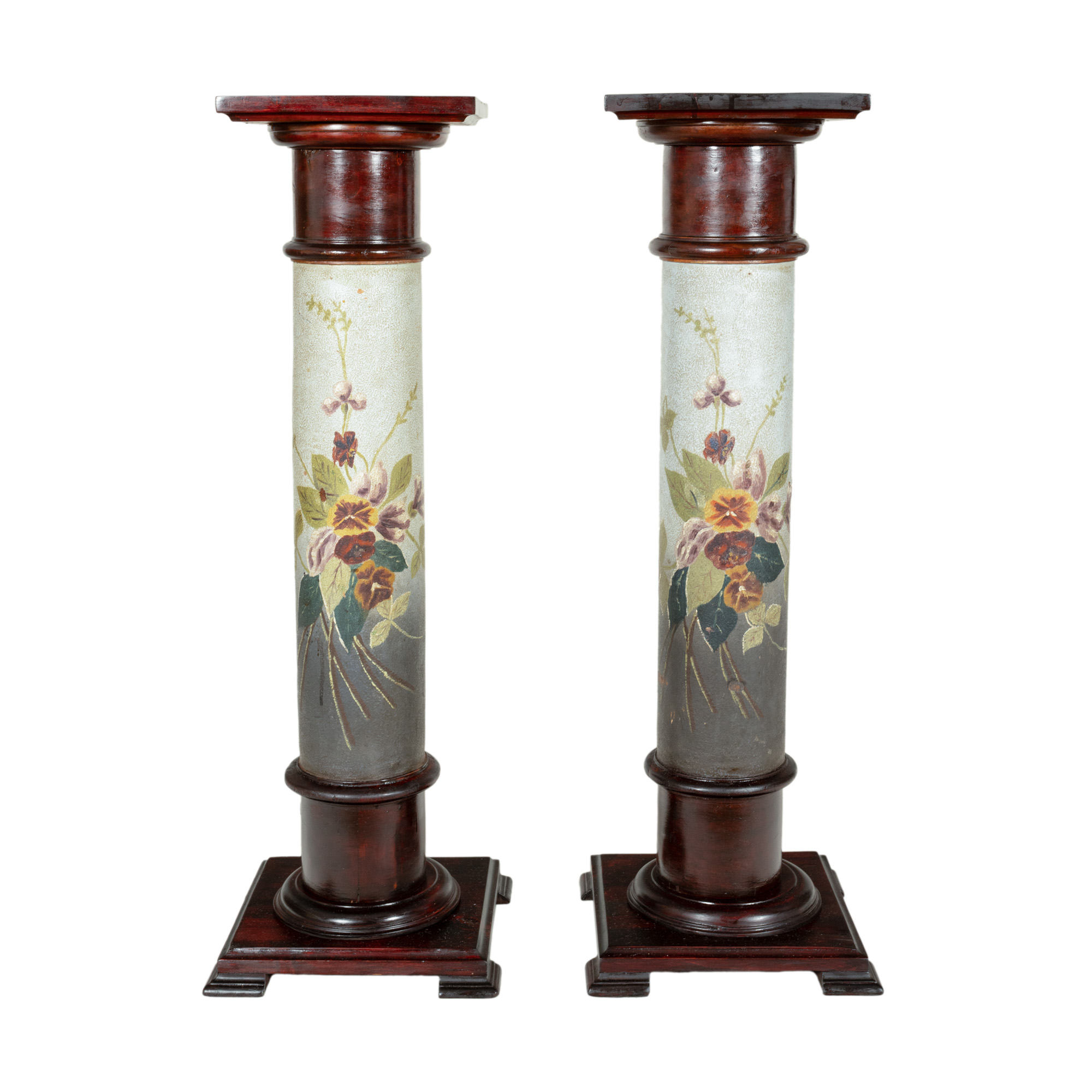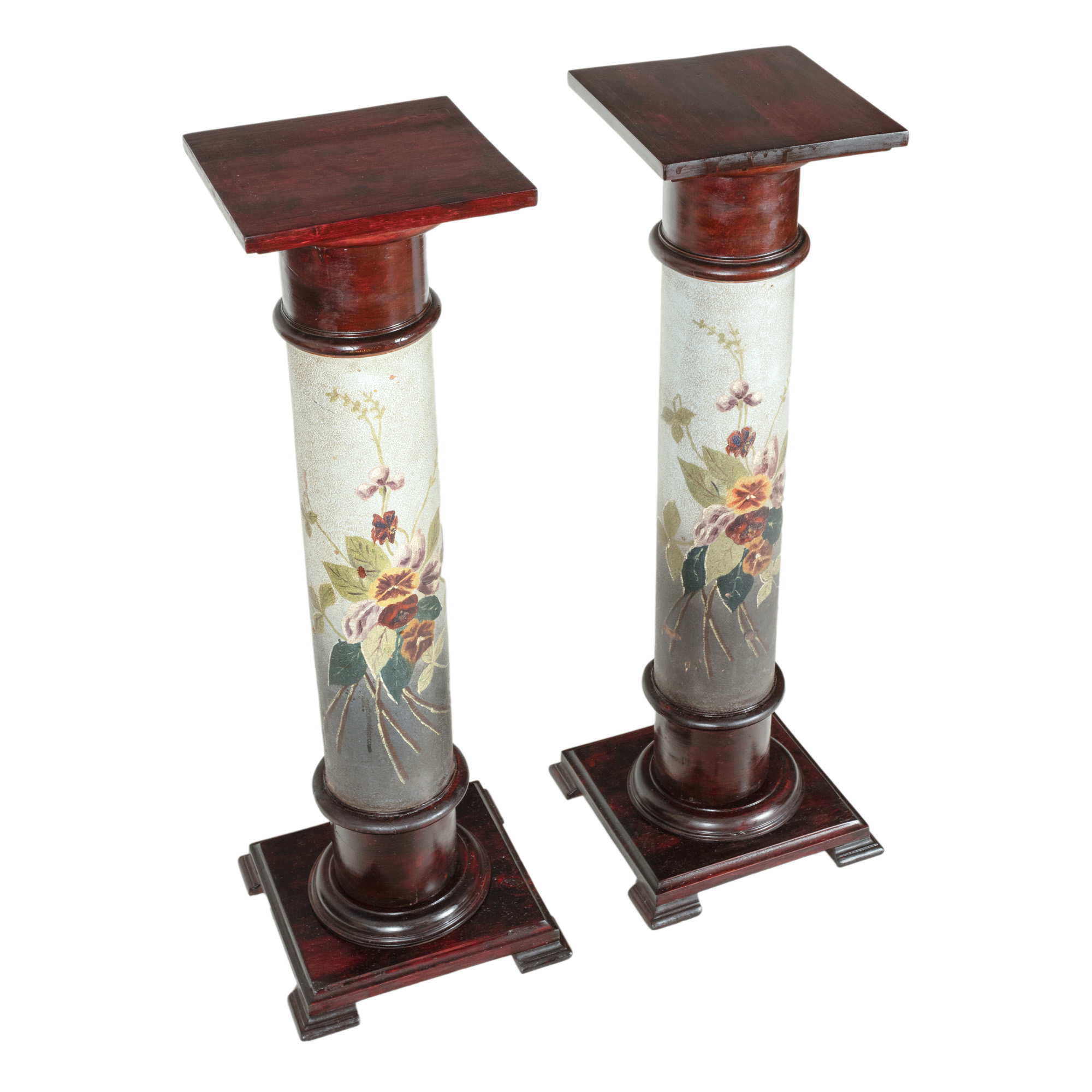 76. Pereche de piedestale din lemn ebenizat, cu decor floral pictat, începutul sec. XX