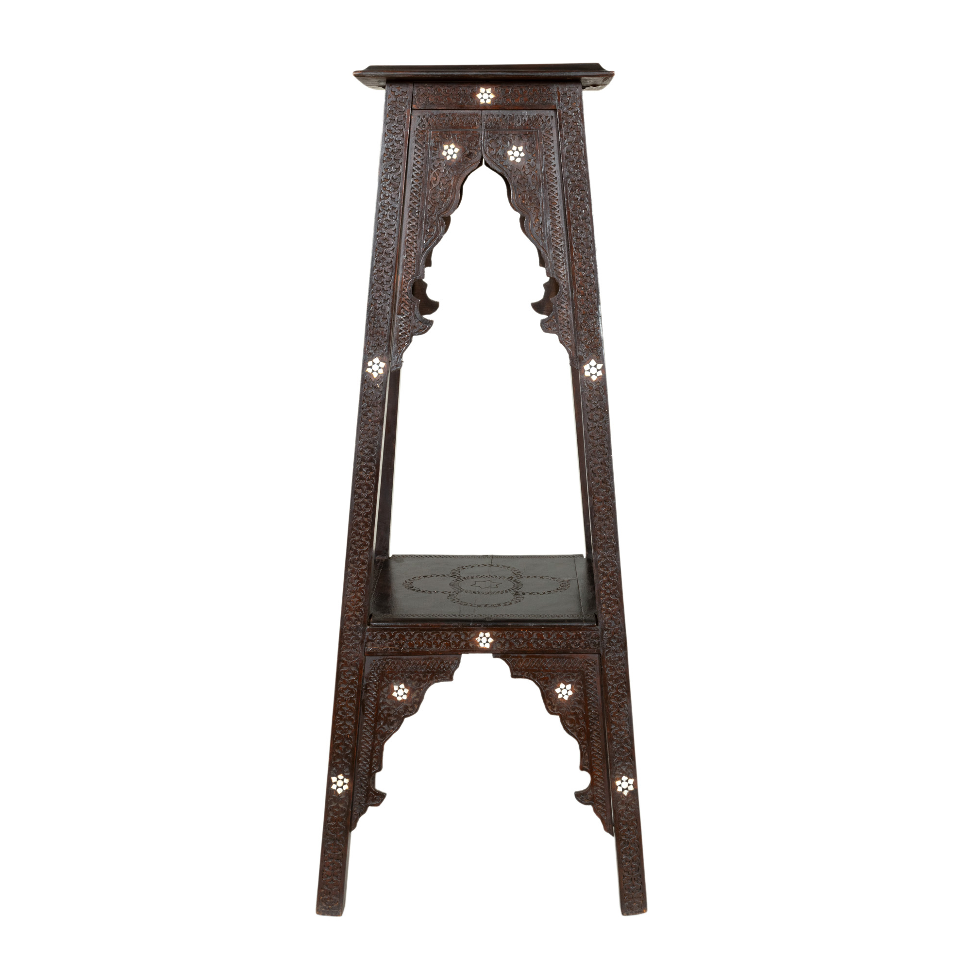 14. Piedestal în stil Maur, din lemn ebenizat, decorat cu sidef și arabescuri, mijlocul sec. XX